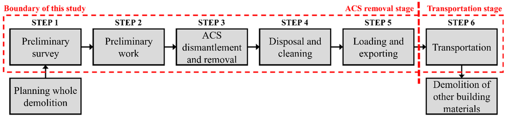Demolition process of building and boundary of this study: (1) preliminary survey; (2) preliminary work; (3) ACS dismantlement and removal; (4) disposal and cleaning; (5) loading and exporting; and (6) transportation. If the result of Step 1 concludes that the building is ACM-free, the ACS removal process can be omitted, and the demolition can commence immediately.