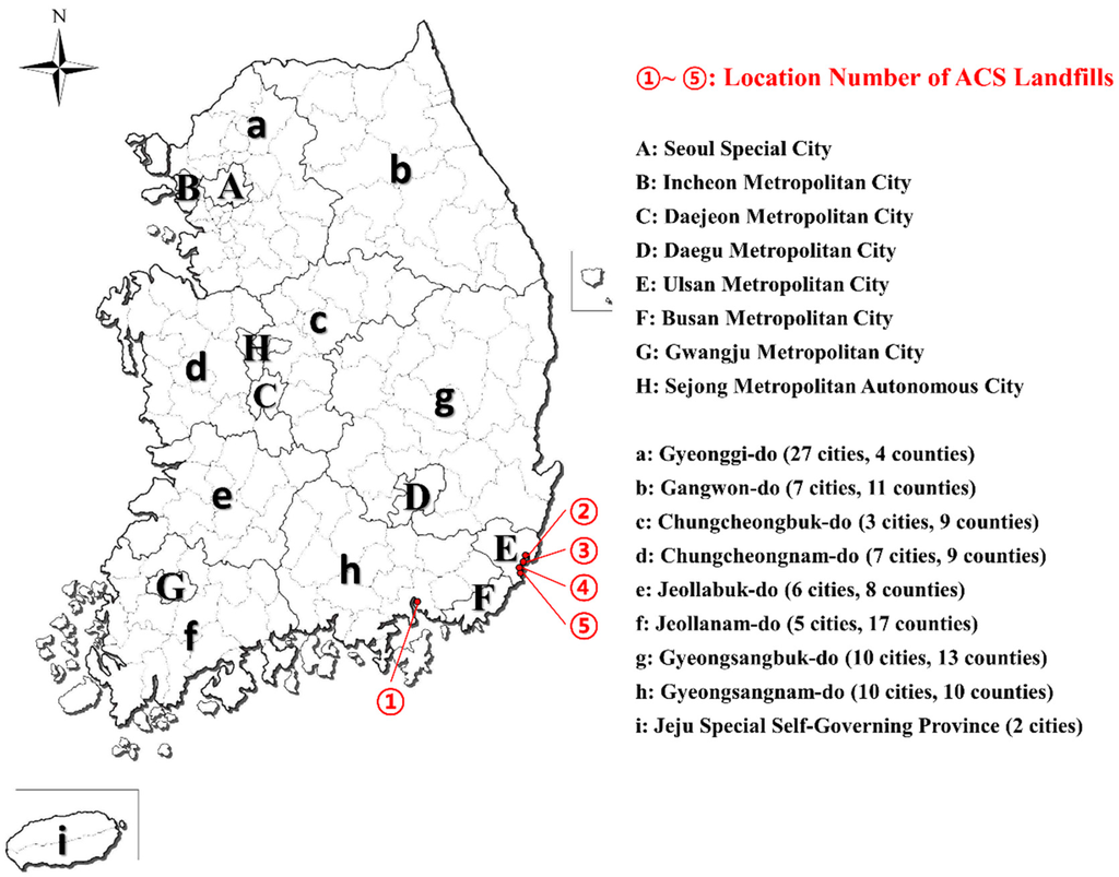 Local governing units of Korea. Metropolitan governing units (thick line, upper case), local governing units (thin line, lower case), and locations of ACS landfills are shown.
