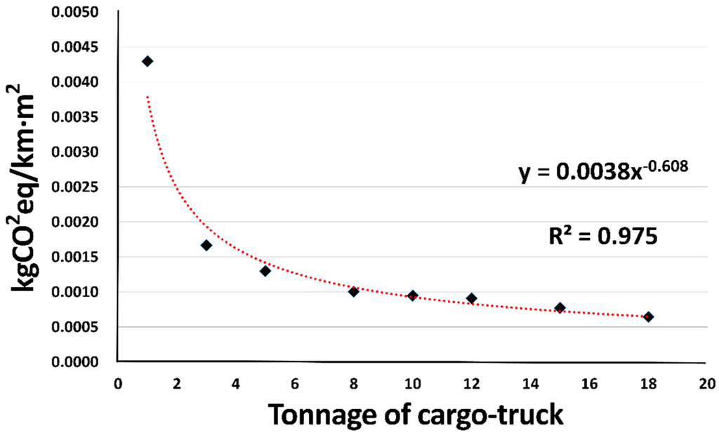 Average mileage of a cargo truck for each tonnage of load, derived from a study on plans for reducing economic freight transportation distance of mass transportation means, by Korea Transport Institute (2011) [].