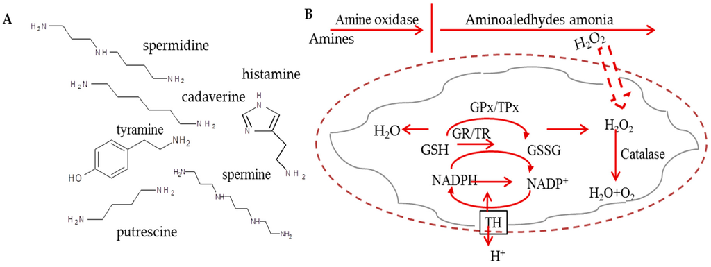 (A) The chemical structure of studied biogenic amines; (B) The scheme of amines oxidation in plants, their effects on damaging of membranes and defense mechanisms. H2O2 can be removed by catalase and HO· by mannitol. The defense mechanism of GPx/GR and TPx/TR systems and nicotinamide nucleotide TH are also shown. In the scheme, GPx stays for glutathione peroxidase; GRx for glutathione reductase; MPT for mitochondrial permeability transition; TH for transhydrogenase; TPx for thioredoxin peroxidase; and TR for thioredoxin reductase. This scheme was inspired by Agostinelli et al. [2].