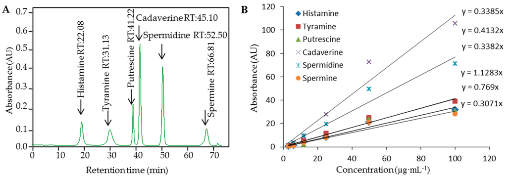(A) Typical IE chromatogram of standard solution composed of selected BAs (100 µg·mL−1); (B) Calibration curves measured under the optimal conditions are shown for Histamine, Cadaverine, Tyramine, Spermindine, Spermine, and Putrescine.
