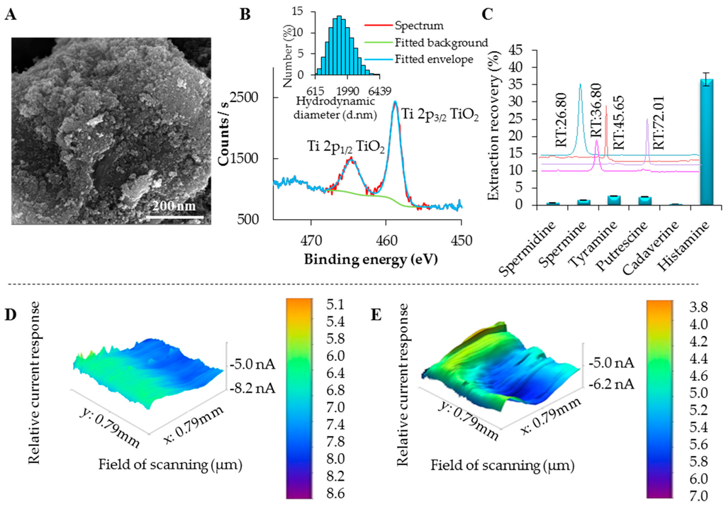 Basic characterization of prepared PMPs. (A) Micrograph, expressing microparticles surface and morphology, the length of scale bar is 200 nm; (B) XPS narrow scan of Ti2p of MAN18; (C) Binding specificity of the prepared particles after application of 100 µg·mL−1 of selected Bas. Chromatograms showing various retention times of BAs immobilized on PMPs, with expression of their peak area representing the amount specifically bound on PMPs. Scanning electrochemical microscopy 3D images characterizing the PMP electrochemical surface changes after binding of Him, relative current response of PMP surface: (D) for blank PMPs without Him bound to their surface and (E) for PMPs after binding of Him.