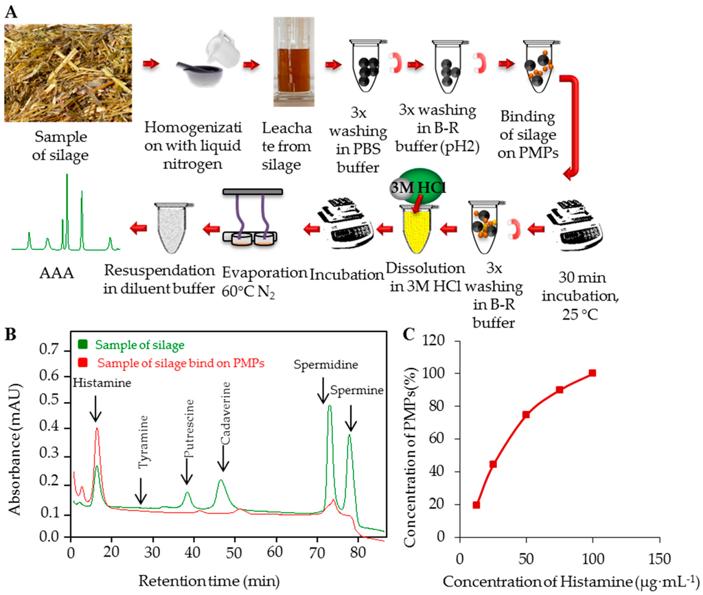 (A) Scheme of isolation of biogenic amines from silage sample of PMPs; (B) Typical chromatograms overlay: red—Samples of silage bound on PMPs and green—Sample of silage before isolation on PMPs; (C) Saturation curve measured under the optimal conditions within tested concentration range 2, 4, 8, 12, and 16 mg·mL−1 of PMPs.