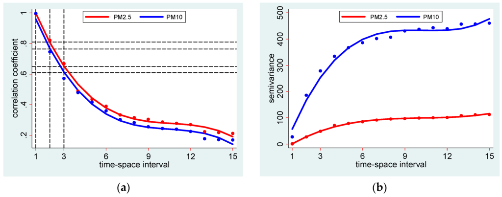 As shown in Figure 2a, polynomial fitted autocorrelation at spatiotemporal interval 2 (i.e., 2 days and 0.05° distance) was 0.81 (or R2 ~ 0.66) for PM2.5 and 0.76 (R2 ~ 0.58) for PM10, respectively. As in Equation (4), autocorrelation is the ratio of covariance to variance, autocorrelation (ρ2(s,l)) ~ R2. This means the covariance of PM2.5 and PM10 within 2 day time interval and 0.05° distance accounts for only 66% and 58% of the total variance of PM2.5 and PM10, or 34% and 42% unexplained variance (i.e., uncertainty) if these thresholds are used to compute exposure.