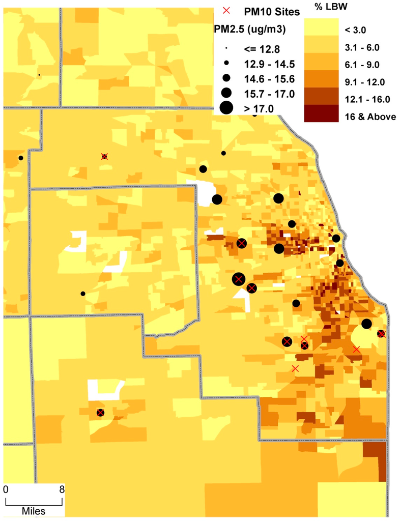 This study focuses on Chicago MSA (Figure 3), which is diverse in terms of spatiotemporal distribution of PM, and socio-economic and demographic characteristics. According to the 2000 US Census, about 20% of the population in the study area was white, 39% Hispanic, and 20% African American. The average daily PM2.5 exposure during the entire gestation (18 µg/m3) was significantly greater than the current annual EPA standards of 12 µg/m3 [18]. However, the value for PM10 was well within the EPA standards.