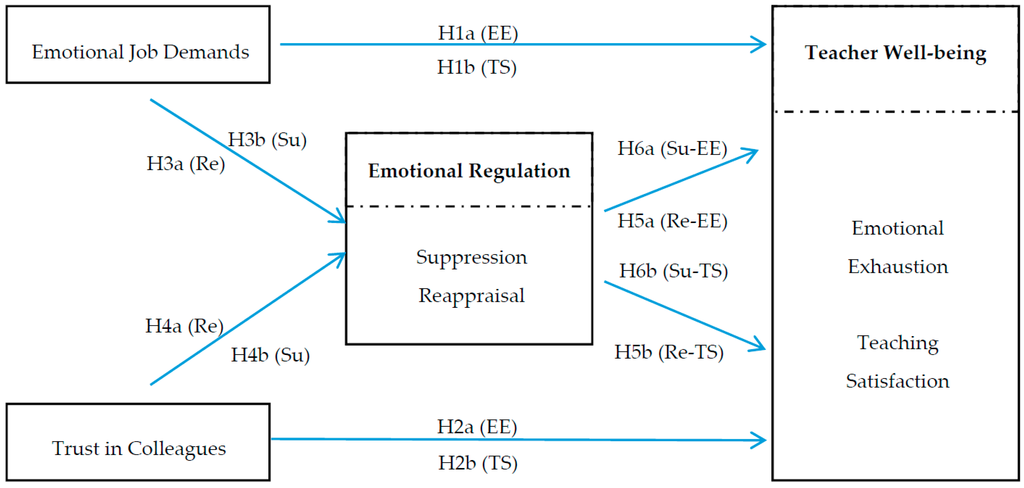 Therefore, the present study examined the relationships between two specific work environment characteristics (i.e., emotional job demands and trust in colleagues), teachers’ emotion regulation strategies (i.e., reappraisal and suppression), and two indicators of teacher well-being (i.e., teaching satisfaction and emotional exhaustion), with a particular focus on the mediating role of emotion regulation. In the following section, the JD-R model and relevant studies are reviewed to establish the hypotheses.