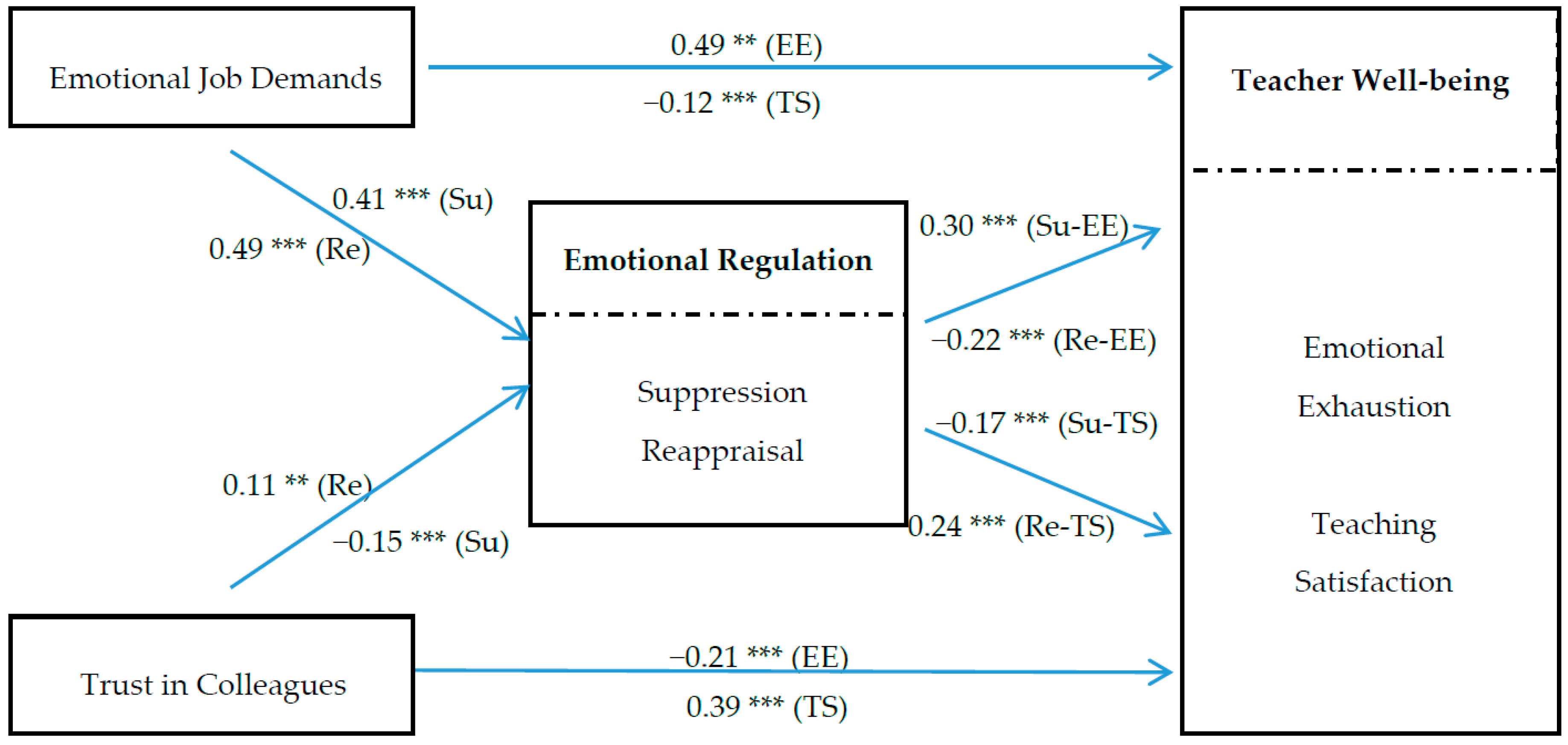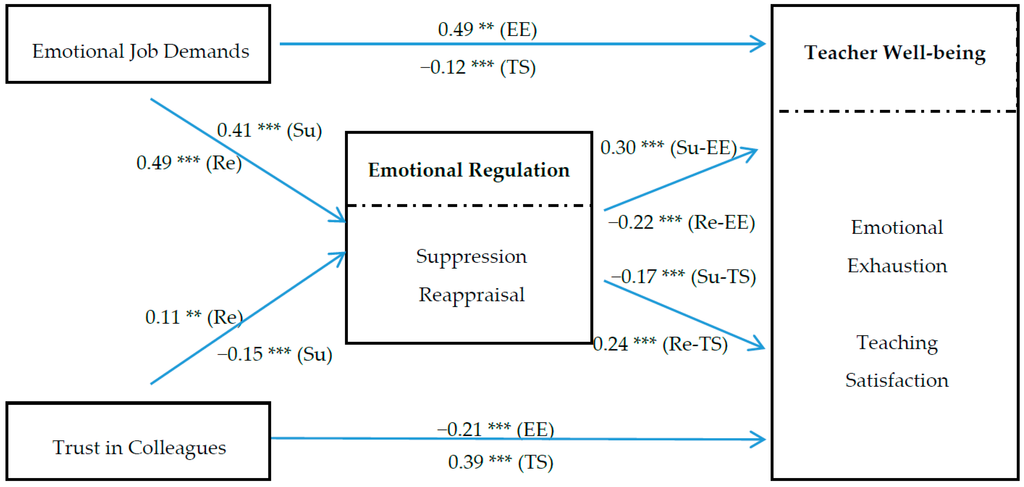 As expected, significant associations existed between the emotional job demands of teaching and the two emotional regulation strategies (Reappraisal: β = 0.49, p < 0.001; Suppression: β = 0.41, p < 0.001), supporting H3. However, trust in colleagues was found to be negatively related to suppression (β = −0.15, p < 0.001) but positively related to reappraisal (β = 0.11, p < 0.01), H4b was supported while H4a was not.