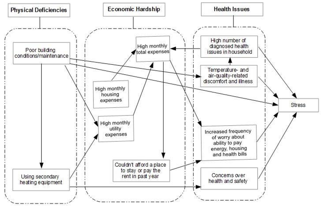 The physical deficiencies discussed here had direct links to stress through chronic exposure to cold temperatures in the home. Indirect links included concerns over health and safety of participants and their families, and the need to use secondary heating equipment leading to further concerns about safety, and about higher energy expenses (Figure 1).
