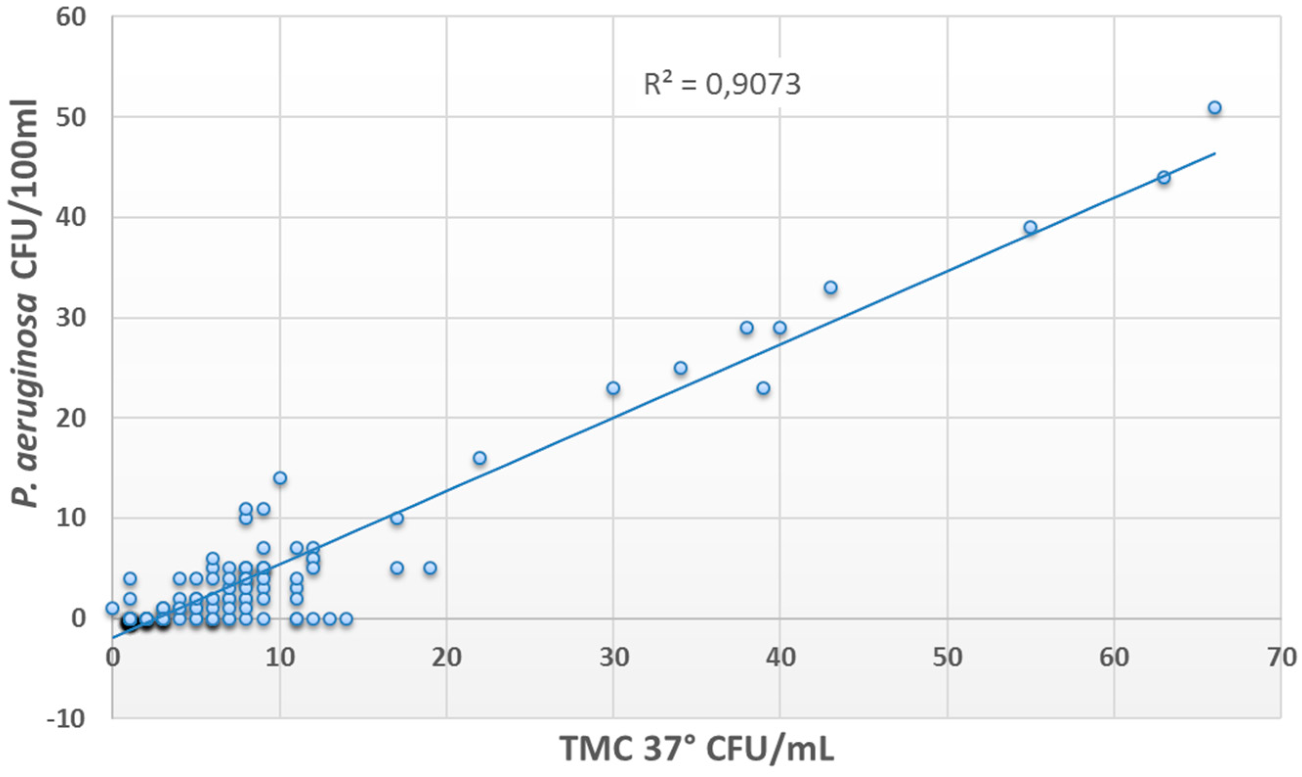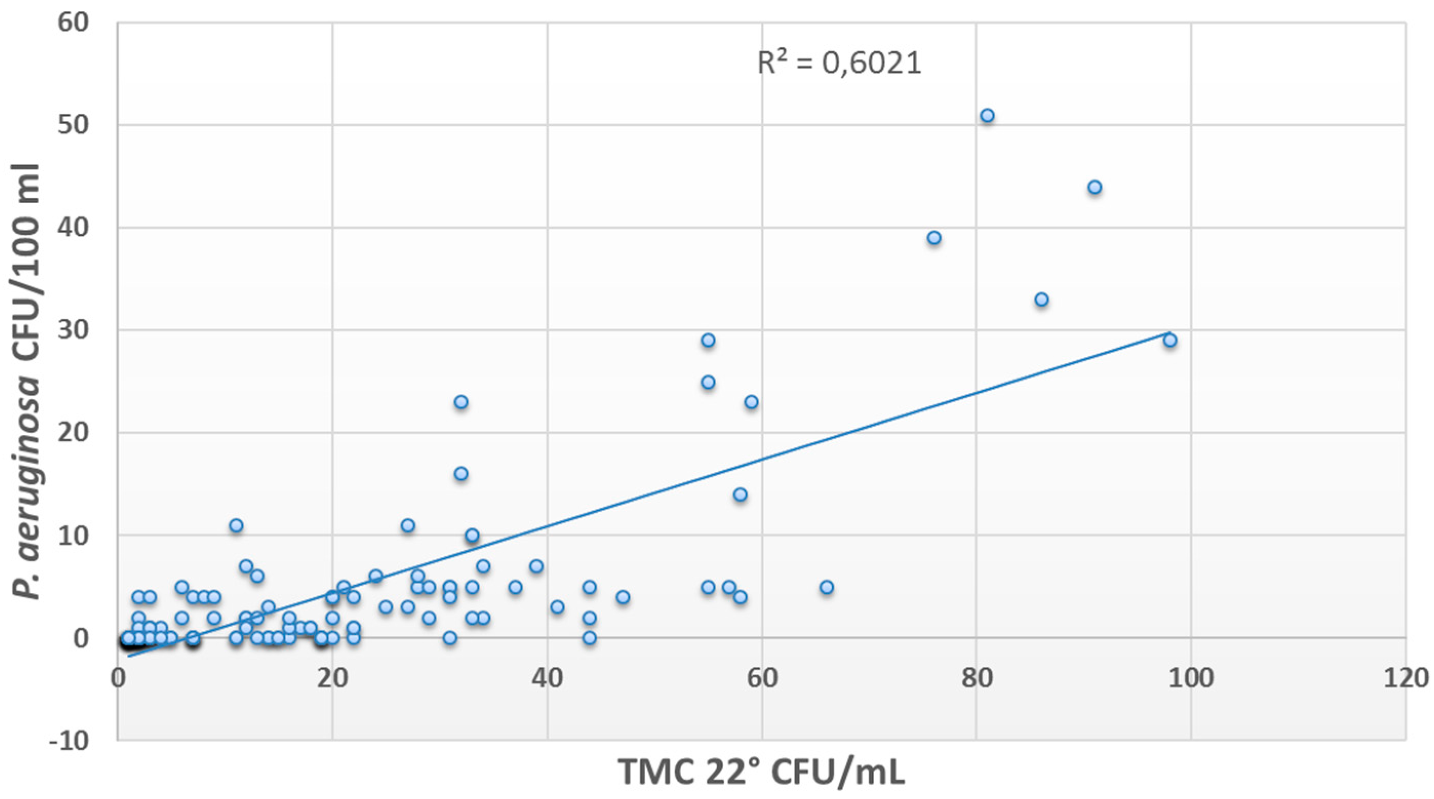 The presence of P. aeruginosa was correlated with the presence of other microorganisms (R2 = 0.9 for TMC 37 °C and R2 = 0.6 for TMC 22 °C) (Figure 2 and Figure 3), while no correlations were found with free or combined chlorine concentration (R2 < 0.1).
