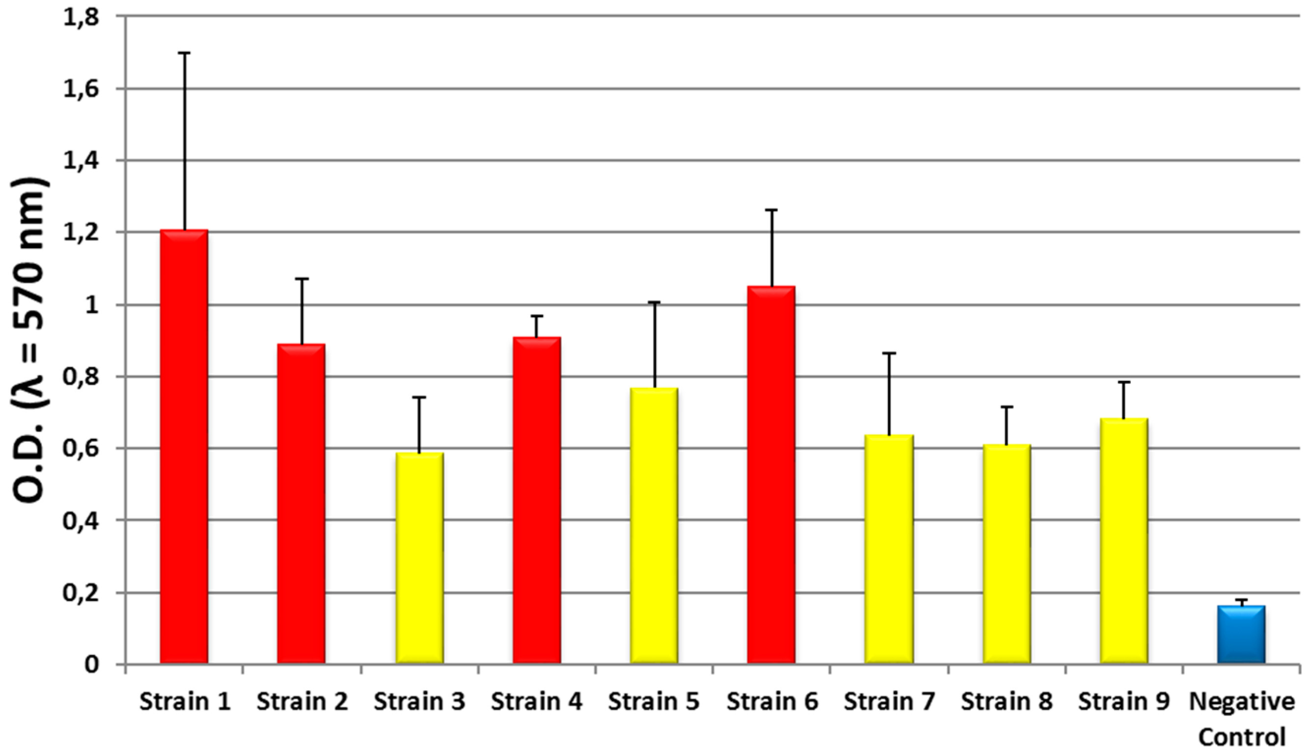 As for the ability to form biofilm, all the isolated strains were moderate- to strong-producers of biofilm (O.D.570 range 0.7–1.2) (Figure 4).