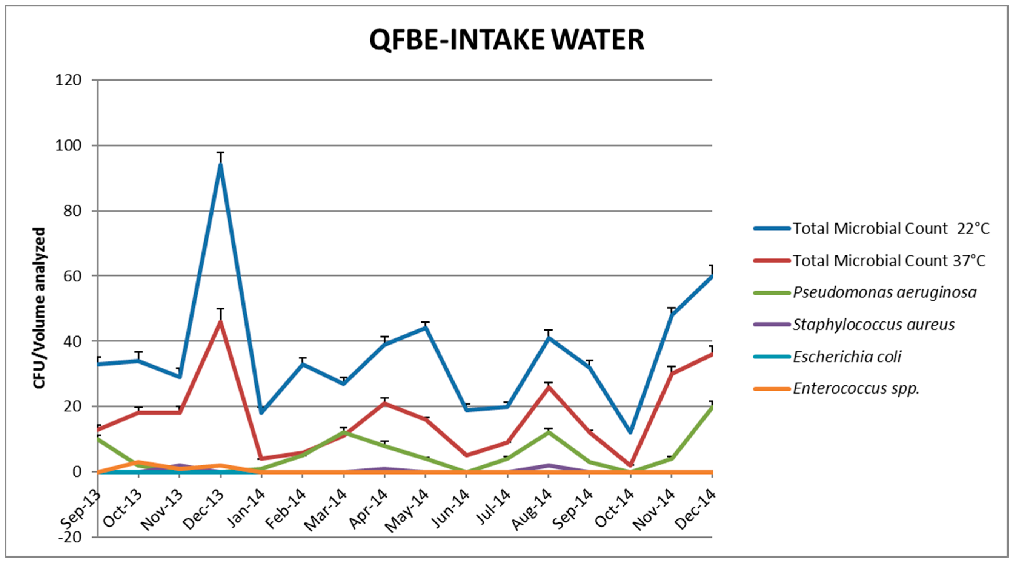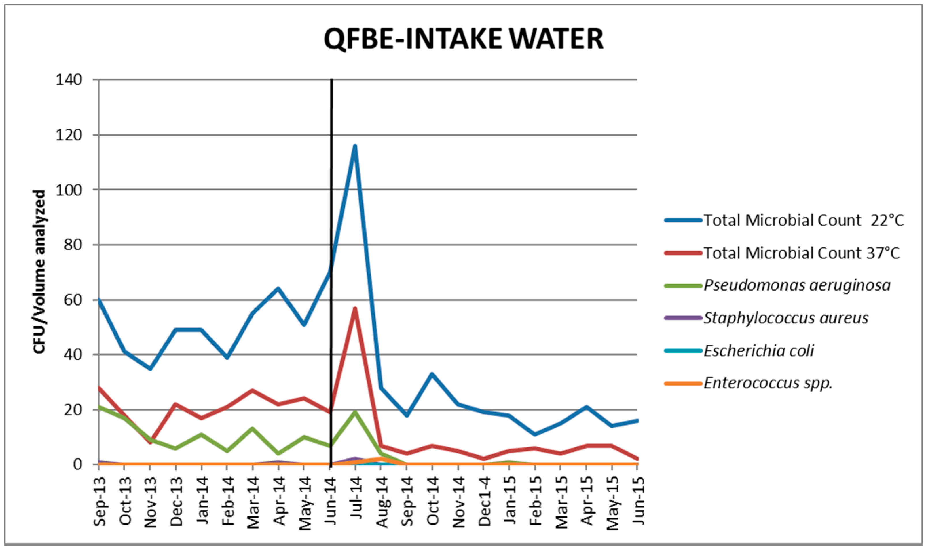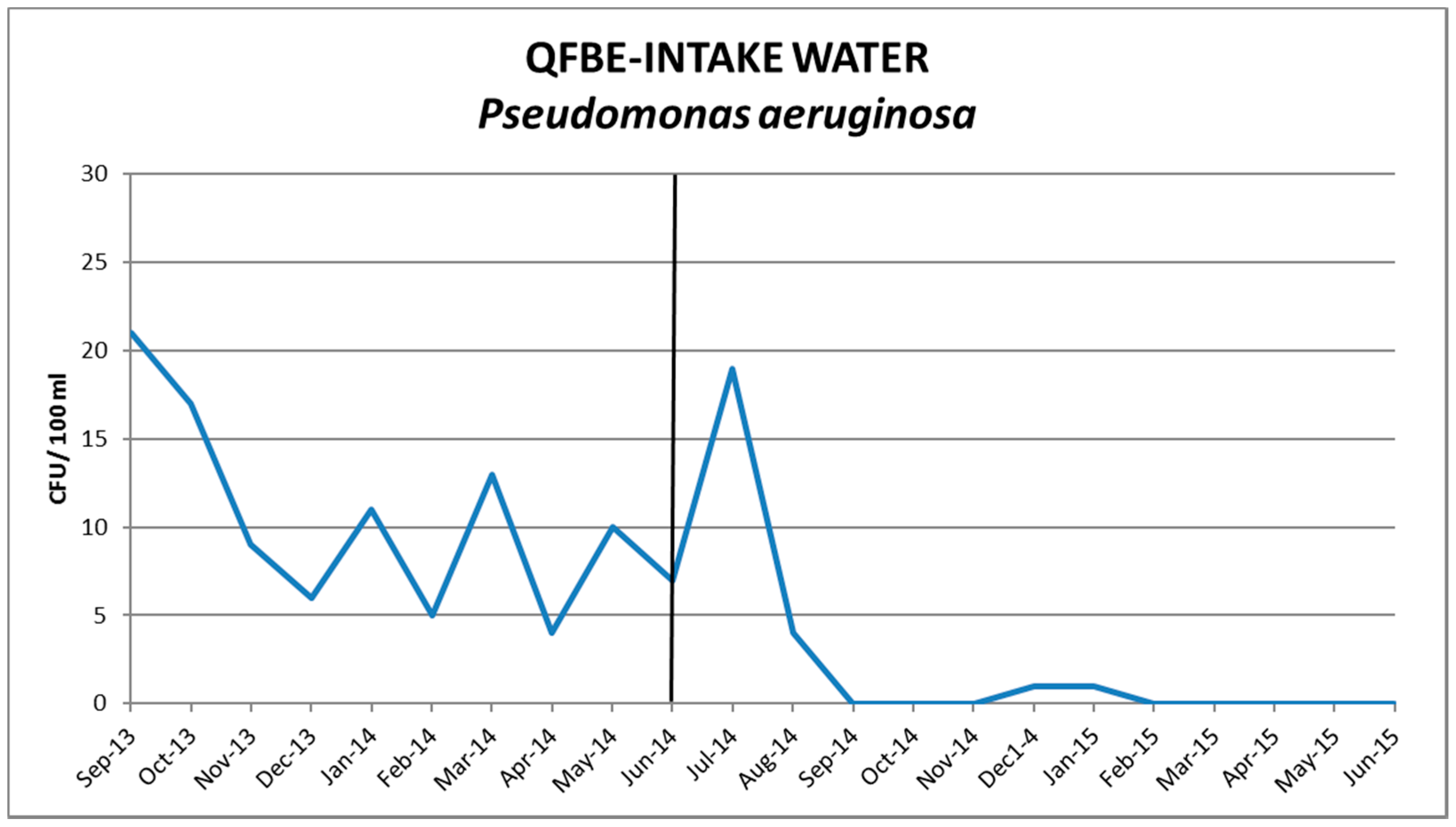 Trends of P. aeruginosa in intake water before and after QFBE installation (June 2014 marked with the black line).