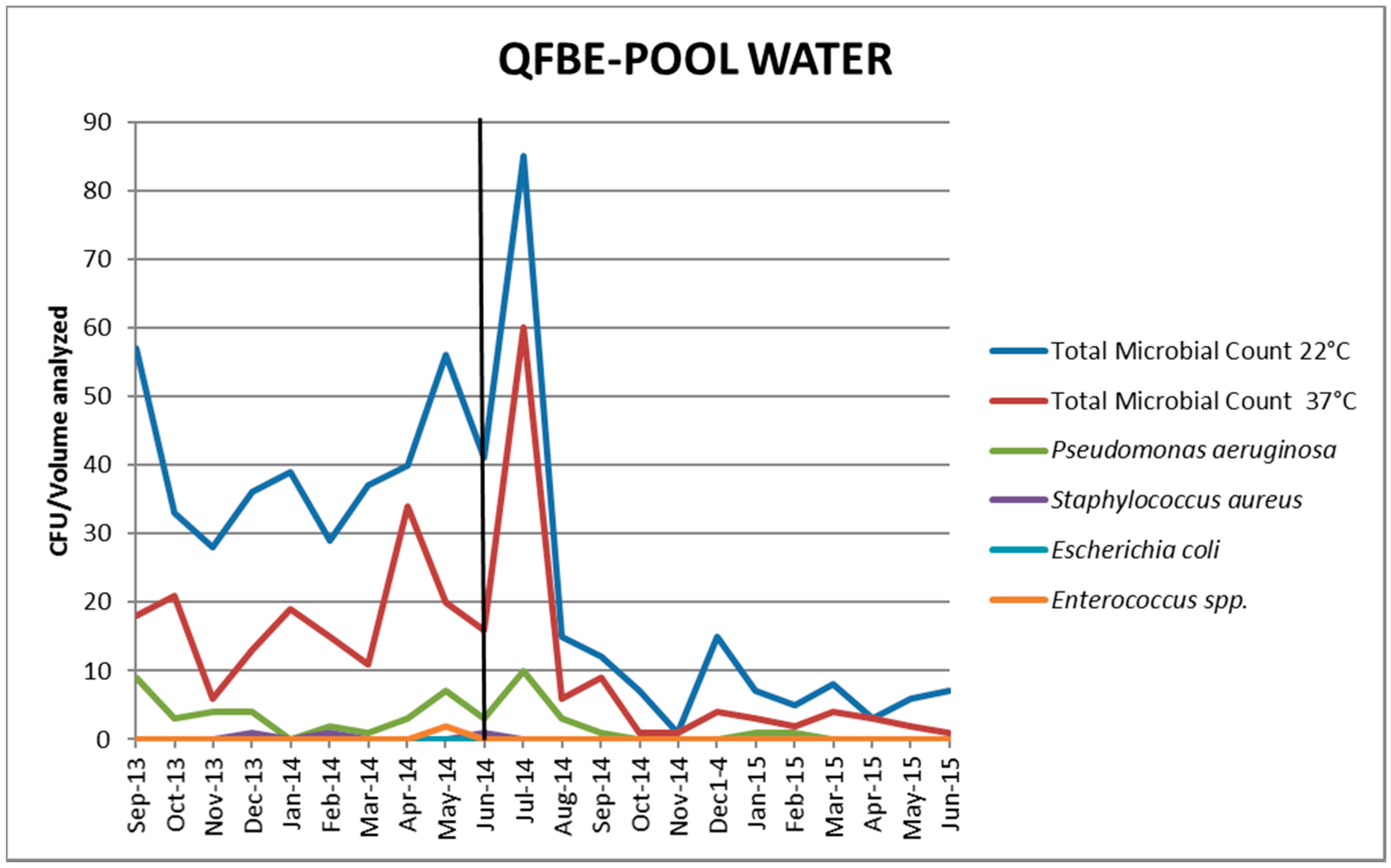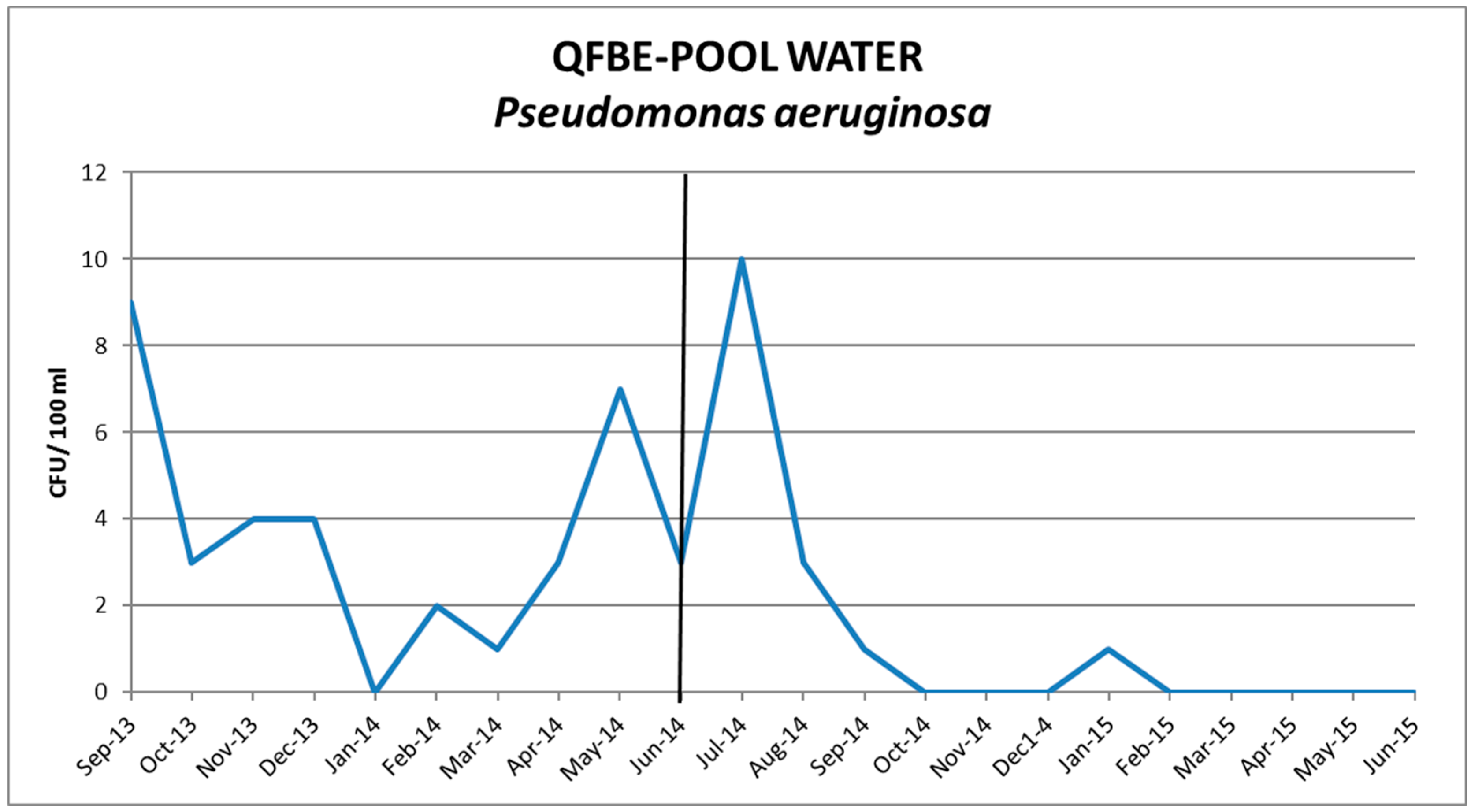 Trends of P. aeruginosa in pool water before and after QFBE installation (June 2014 marked with the black line).