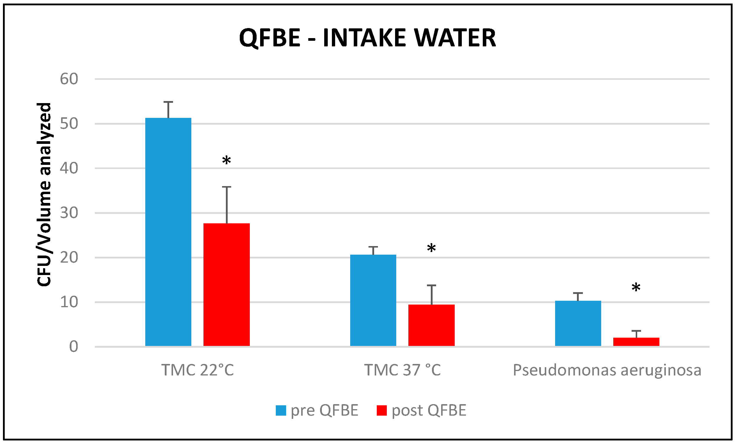 Mean total molecular count (TMC) at 22 °C, mean TMC at 37 °C, and presence of P. aeruginosa before and after QFBE installation in intake water. *: significant differences (p < 0.05).