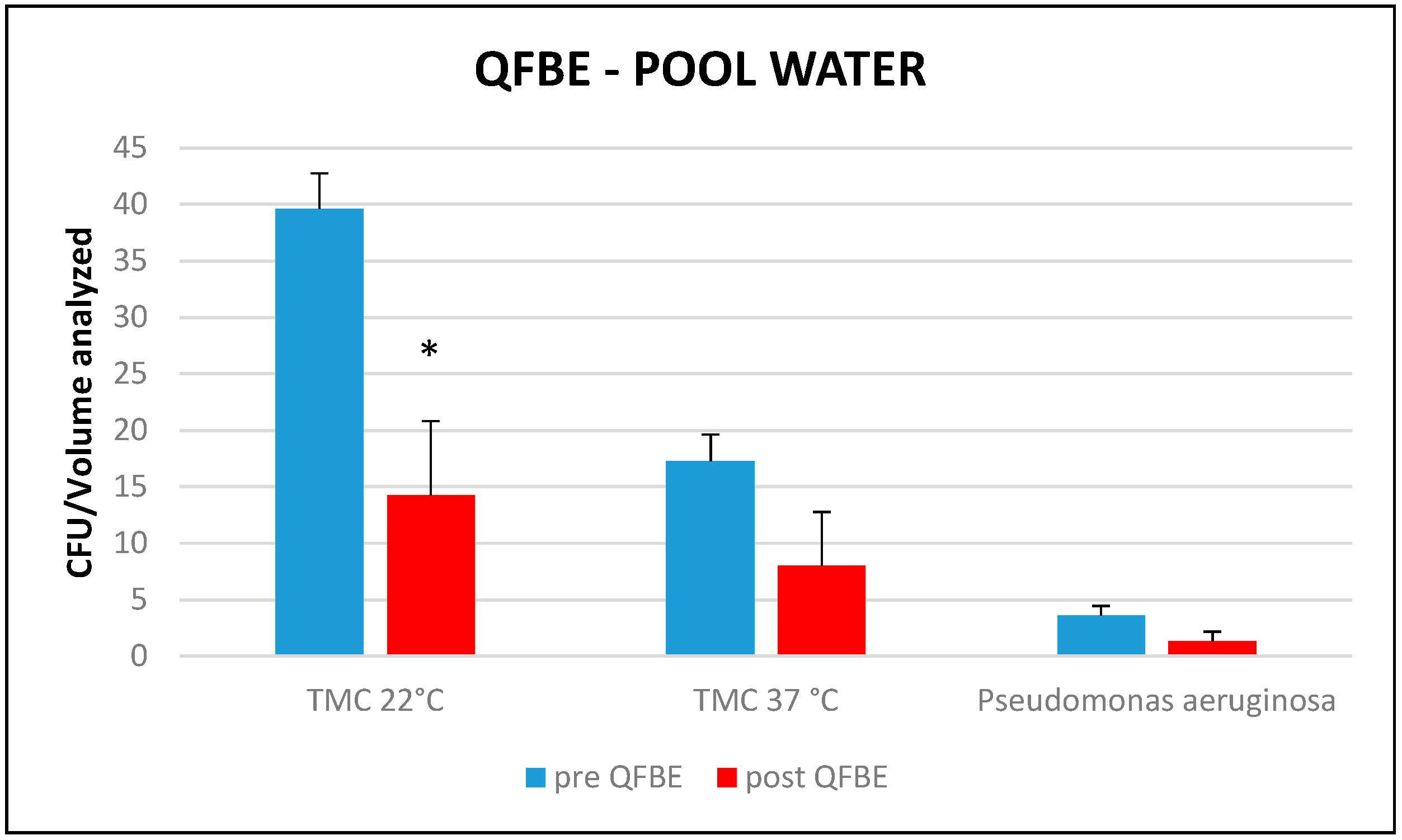 Mean TMC at 22 °C, mean TMC at 37 °C, and presence of P. aeruginosa before and after QFBE installation in pool water. *: significant differences (p < 0.05).