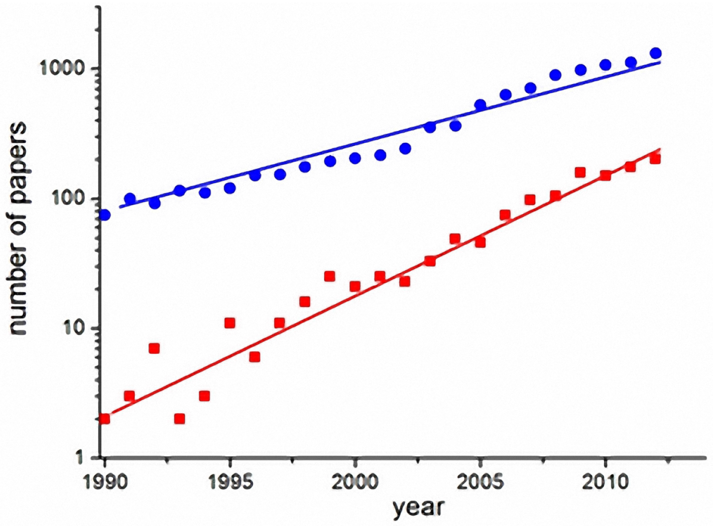 Exponential growth of publications on dengue (blue circles) and specifically on dengue models (red squares) in the last two decades (search done in the ISI-Web of knowledge database) [63].