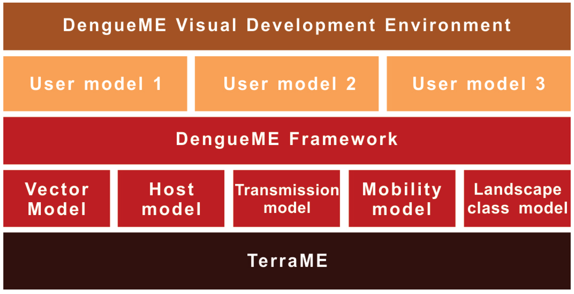 Figure 2 presents an overview of the DengueME framework architecture. In the lower layer is the TerraME platform for environmental modeling, used to build the models. The second layer is the DengueME framework, composed of a set of models and middleware to integrate them. Next, there is a layer formed by the models and scenarios customized by the user. They can be developed using the DengueME VDE, available at the top layer of the architecture.