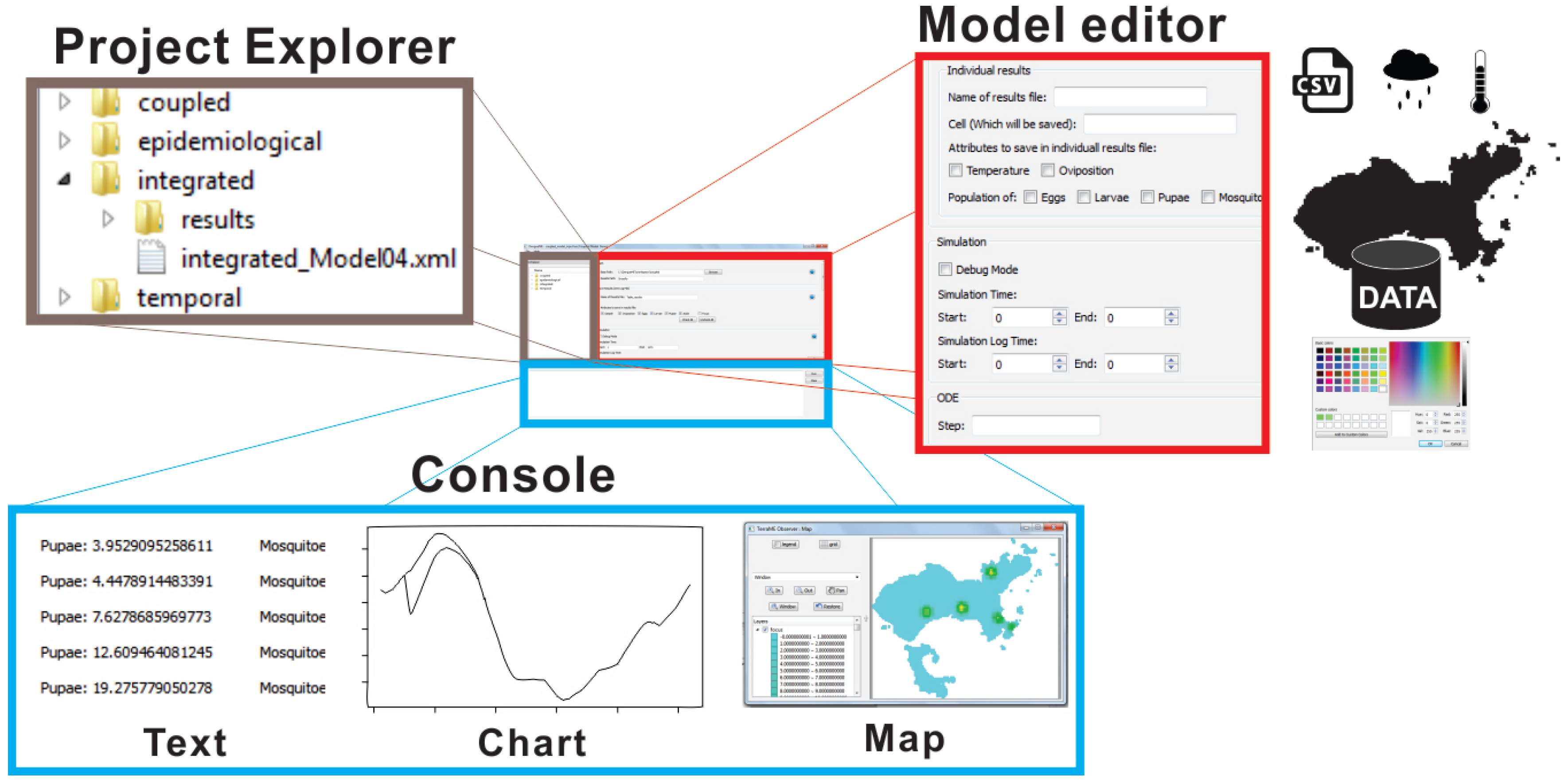 The GUI components of DengueME VDE are presented in Figure 4. The goal is to eliminate barriers related to using programming languages and to make it easier to use the framework. Its design works with the concepts of Workspace (working directory that contains the user’s projects), View (interface components for browsing and/or presenting information on projects and models), and Editor (interface components for editing models). Figure 4 illustrates some of these features: (a) the Project Explorer displays and allows navigation through projects and existing models within the workspace; (b) the Model Editor allows setting model parameters and scenarios (e.g., using the GUI to import meteorological and other data from text files or databases) and output options; (c) the Console view presents information and views derived from the simulations.
