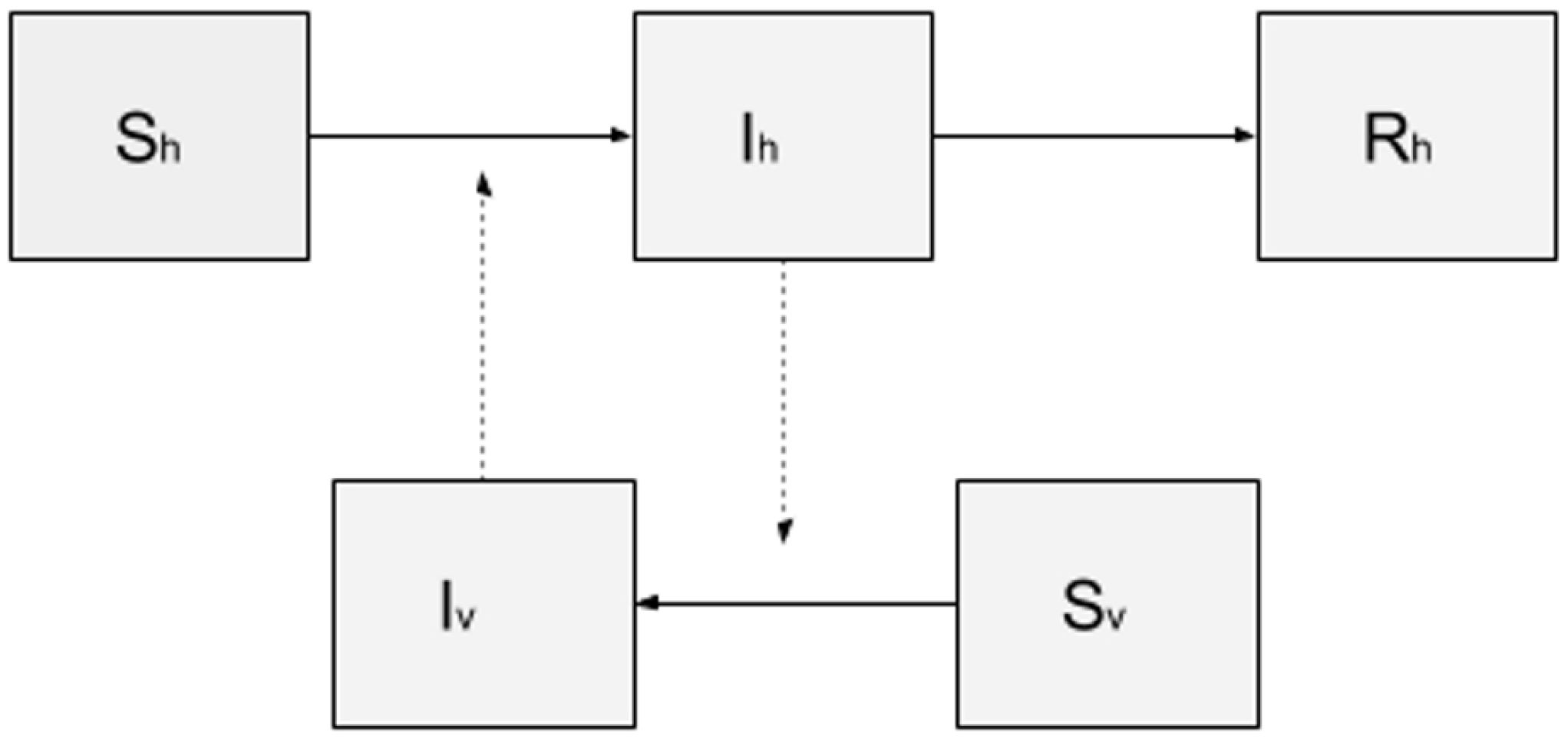 Compartmental model SIR-SI, where the human population is represented by three compartments: susceptible (Sh), infectious (Ih) and removed (Rh); and the mosquito population by two compartments: susceptible (Sv) and infectious (Iv).