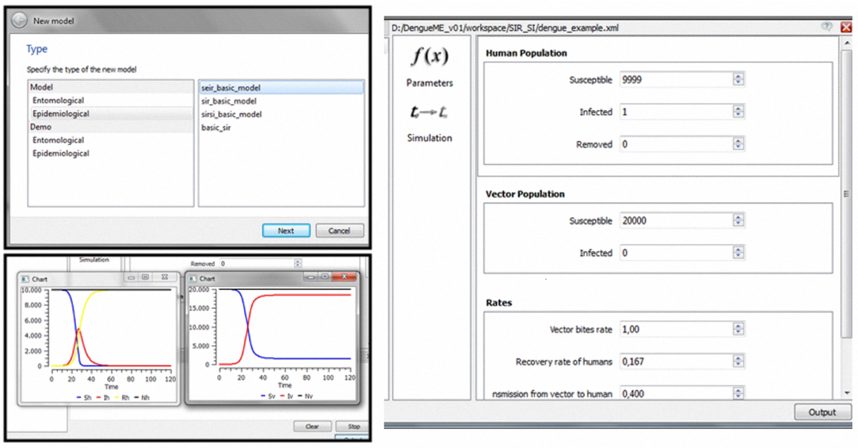 Modeling and simulation using the DengueME VDE: (top left panel)—Wizard to support the creation/selection of models; (right panel)—Graphical interface for parameterization; (bottom left panel)— Execution of the model and visualization of the simulation results.