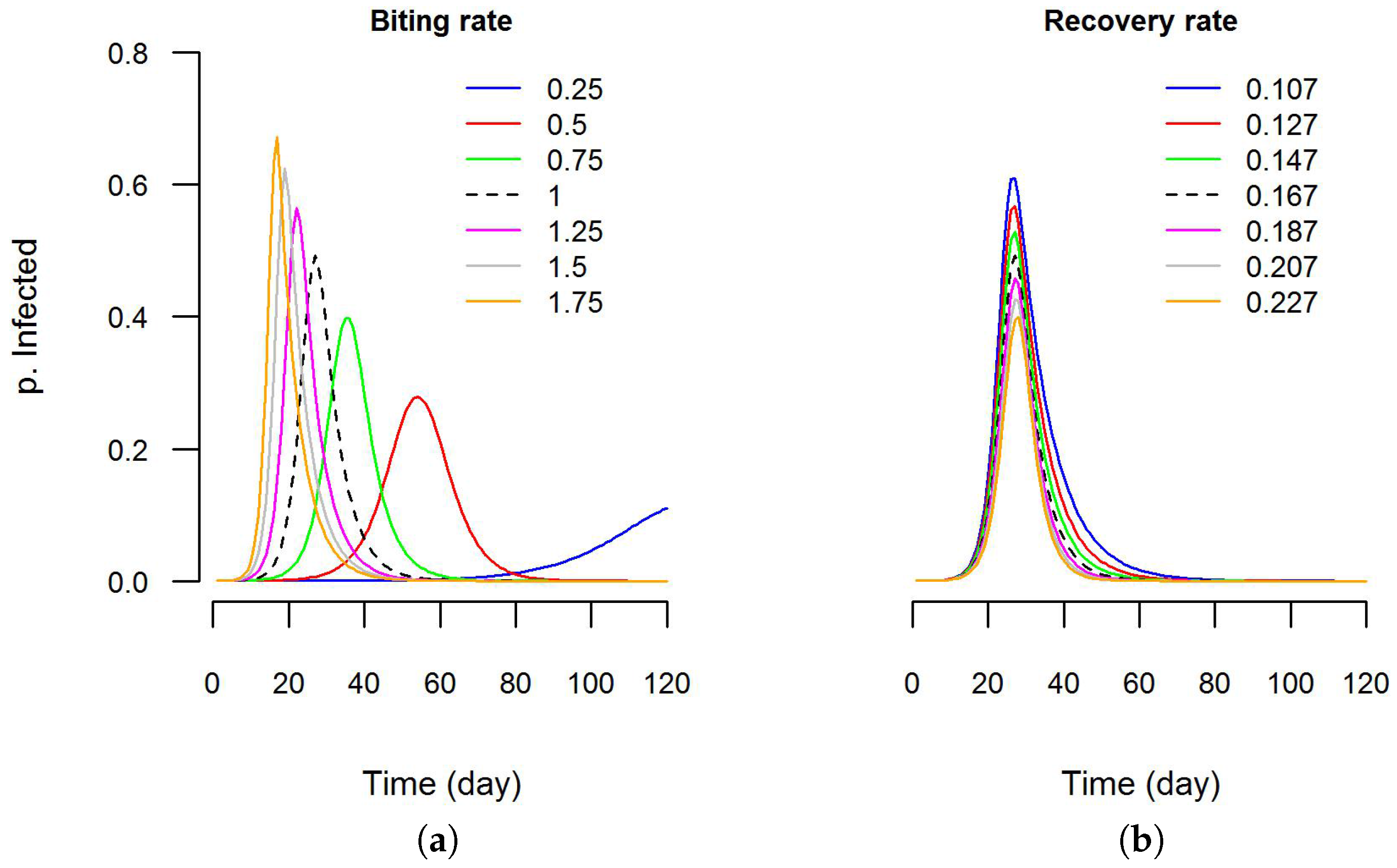 Sensitivity analysis using DengueME: (a) sensitivity of the predicted epidemic curve to variations in the biting rate parameter and; (b) recovery rate parameter. The Y-axis is the proportion infected in the human population. The black dashed line is the model output with default values (as used by Nishiura (2006) [106]).