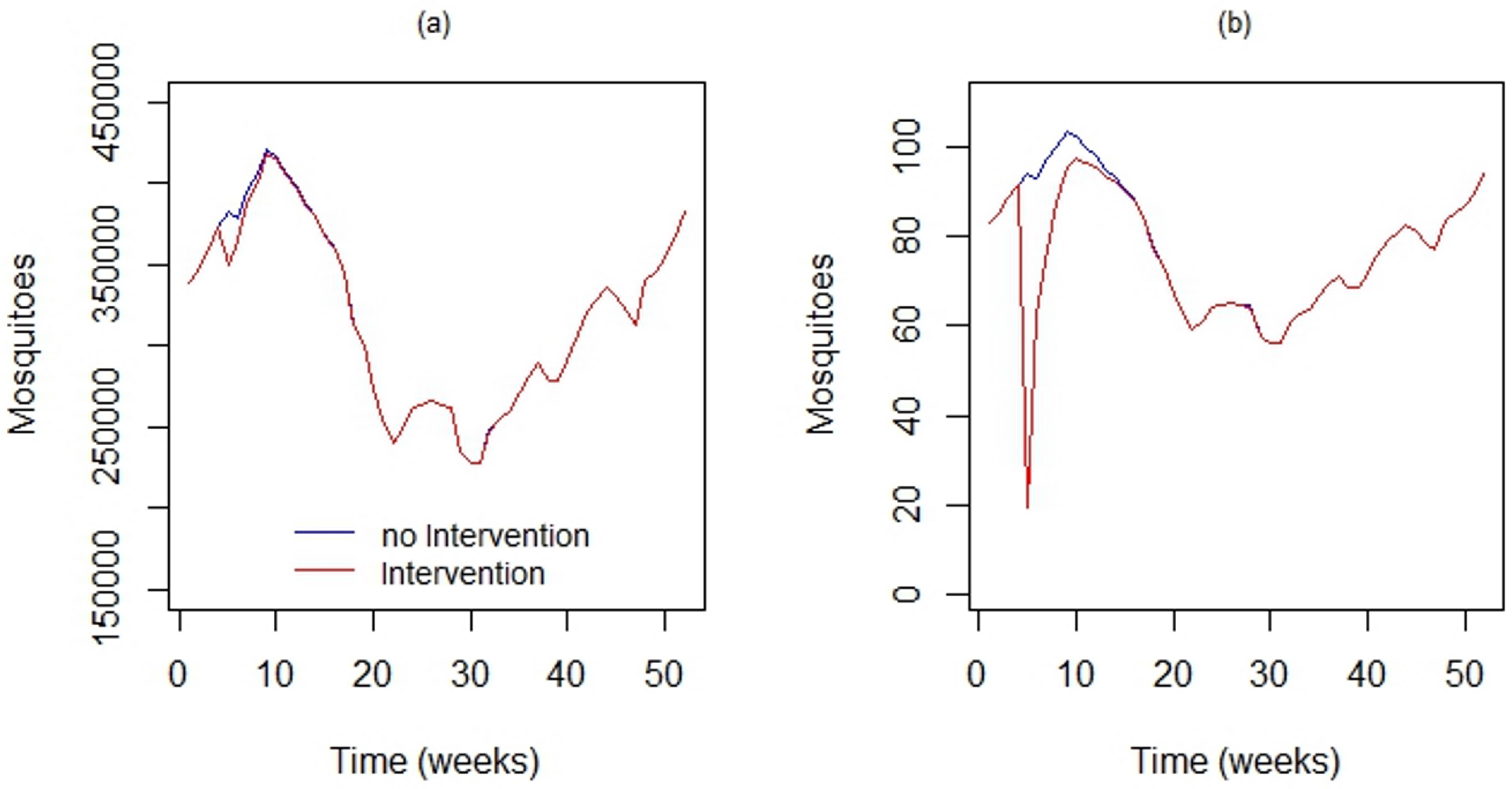 Using DengueME to simulate locally-applied chemical interventions. Comparison between the the vector population in the study area with and without the application of adulticide. (a) Global impact considering the entire study area; (b) local impact in a 100 × 100 m area [63].