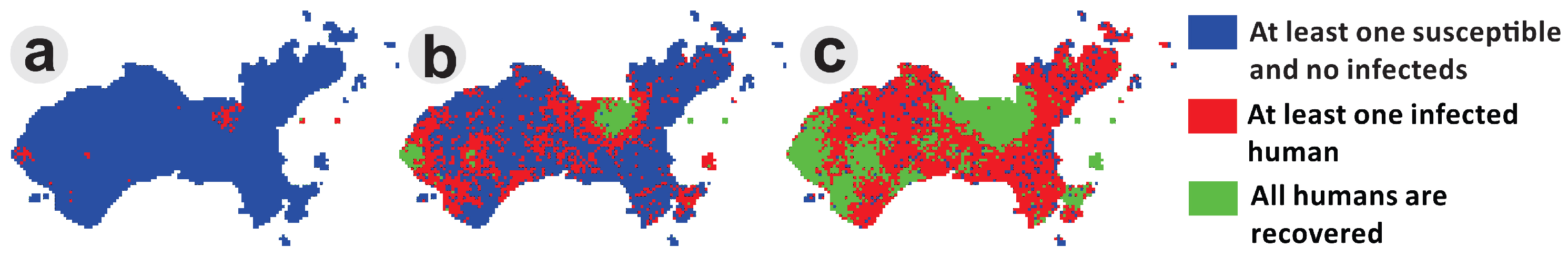 Using DengueME to simulate dengue spread from commercial to residential areas of a city. Panels show three moments of a simulated epidemic in the study area. (a) Beginning of the simulation with a few hotspots; (b) propagation waves from the hotspots; (c) overall dissemination and pockets of immunity [63].