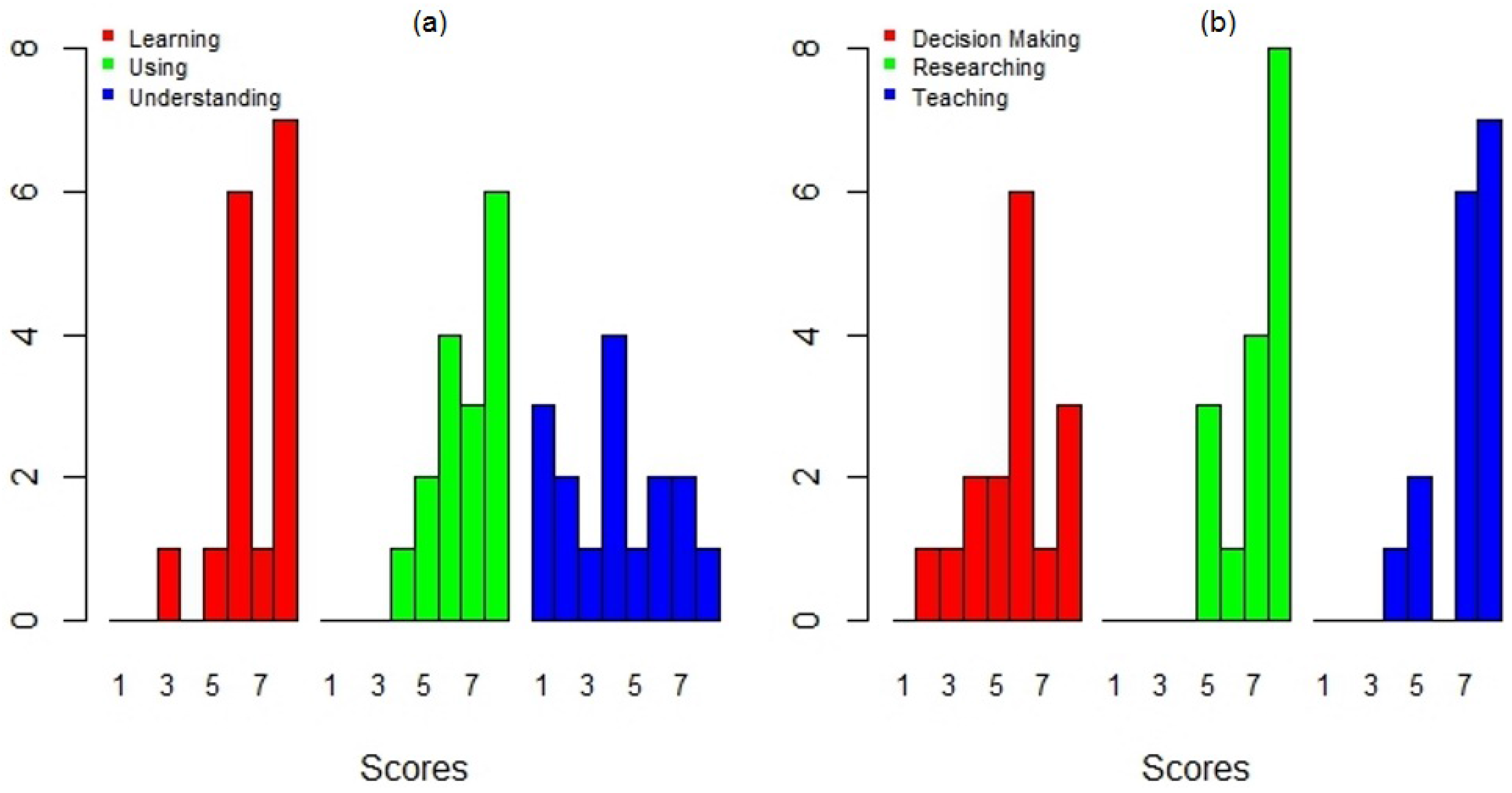 User’s evaluation of the DengueME graphical interface: (a) support for learning, using and understanding dengue models; (b) applicability potential for supporting decision making, researching and teaching [63].