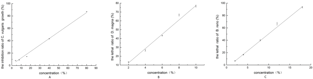 There was no significant difference between the dimethyl sulfoxide control group at the highest concentration and the blank control group for C. vulgaris growth rate, D. magna lethal rate, and B. rerio lethal rate by analysis of variance. This indicated that dimethyl sulfoxide had no repression effect on C. vulgaris, D. magna, and B. rerio in this study. All the results were analyzed by comparing the testing to the blank control groups.