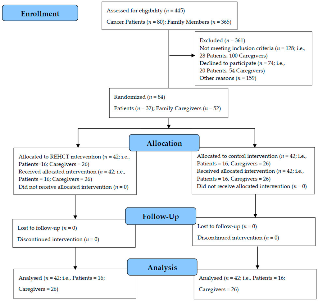 The participants’ written informed consent was obtained. The researchers also developed a manual (the REBT Hospice Care Manual) to guide the treatment process, which consisted of 10 weeks of full intervention and 4 weeks of follow-up meetings that marked the end of the program. The REHCT sessions lasted for up to 45 min and were held once a week for each household. Overall, the participants in the treatment group received 10 sessions of REHCT each.