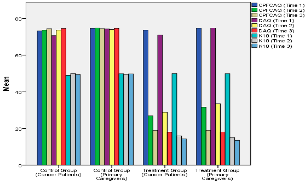 Table 1 show that the mean age of the cancer patients in the treatment group was 48.33 ± 6.17 years while that of the control group was 48.32 ± 6.43 years. Out of the 32 cancer patients who took part in the study, those in the treatment group comprised of 2 (12.50%) male participants and 14 (87.50%) female participants; while the control group comprised of 2 (12.50%) male participants and 14 (87.50%) female participants. Out of those in the treatment group, 10 (62.50%) had breast cancer, 3 (18.75%) had cervical cancer, and 3 (18.75%) had prostate cancer. For the cancer patients in the control group, 10 (62.50%) had breast cancer, 5 (31.25%) had cervical cancer, and 1 (6.25%) had prostate cancer. Furthermore, the data in Table 1 show that the mean age of the primary caregivers in the treatment group was 55.75 ± 3.03 years while that of the control group was 55.74 ± 3.05 years. Out of the 52 family caregivers who took part in the study, those in the treatment group comprised of 4 (15.38%) male participants and 22 (84.62%) female participants; while the control group comprised of 4 (15.38%) male participants and 22 (84.62%) female participants (see Table 1).