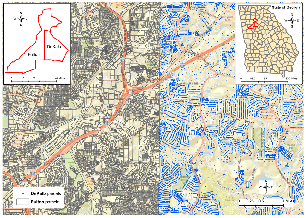 As a pilot research project, two counties, Fulton and DeKalb, in the metropolitan area of Atlanta, Georgia were selected as the study area since both counties have parcel data available for this research. In the year 2014, Fulton County had 353,723 parcel polygons, while DeKalb County released 235,681 parcels as point features. Figure 1 displays the two different types of parcel data sets covering a part of the two counties, since the full scale of the parcel datasets cannot be clearly represented and differentiated in such a small figure. Both datasets contain the information about the unique identifier, address, and land use type of the parcel along with other information. The zoning code for the land use class of the parcel could reveal whether the parcels are used as agricultural, business, commercial, industrial, residential, exempted areas, or for other purposes. The class code in the parcel datasets helps to differentiate whether a certain address is a home address or not by checking whether the corresponding parcel is classified as a residential area or not.