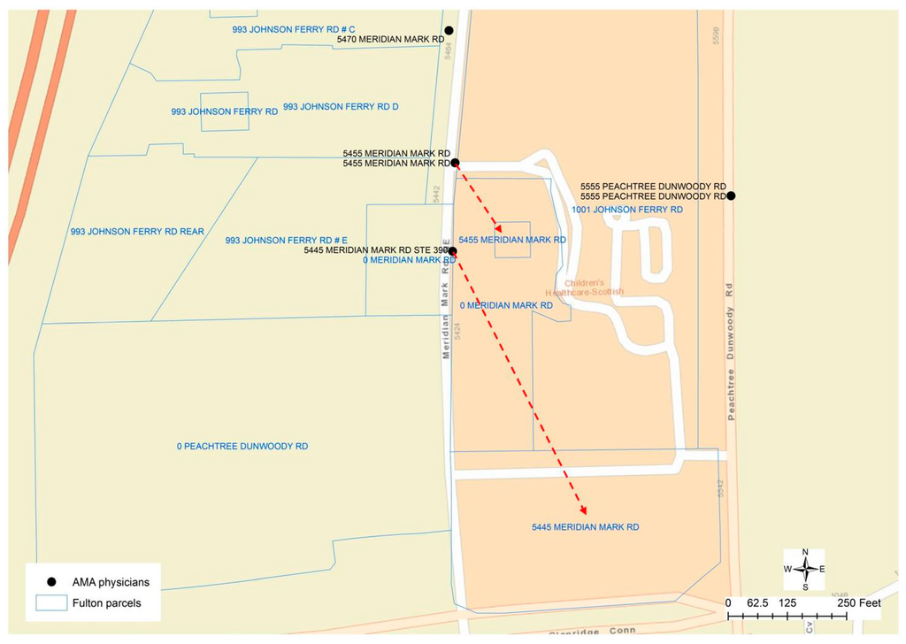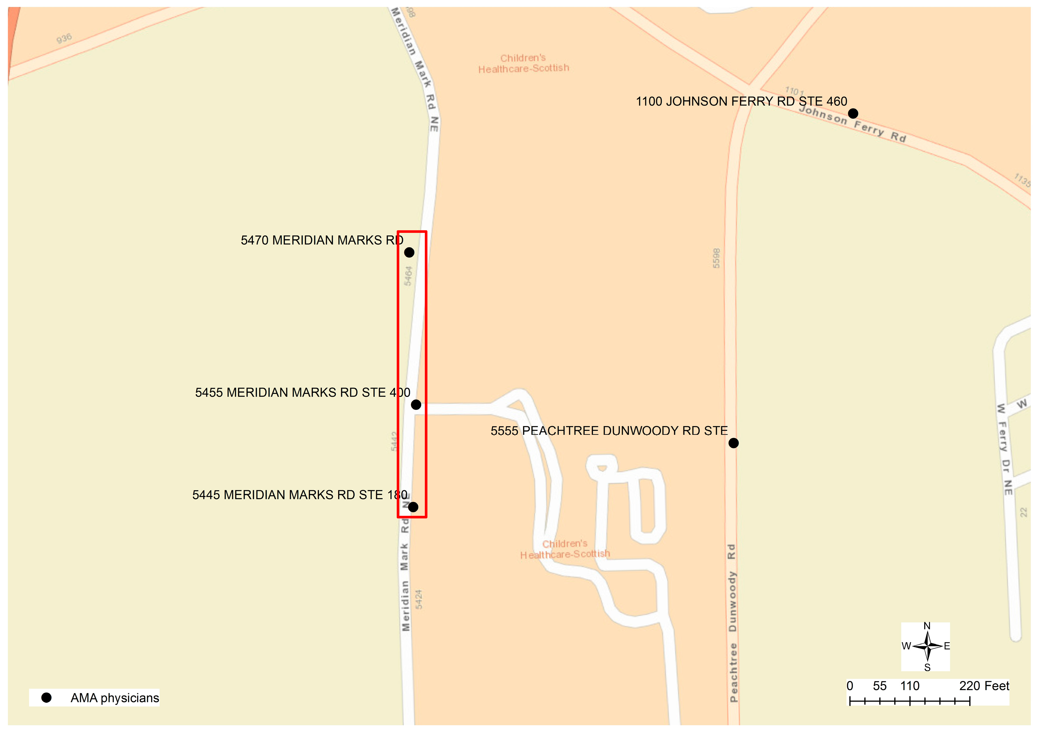 Although the result of geocoding would have inaccuracy problems, geocoded physician addresses could be helpful for researchers to perceive the spatial location and distribution of physicians from a macroscopic perspective. However, geocoding itself cannot help to differentiate whether the address provided by a physician is the home address or practice address. Matching the physicians’ addresses to the addresses in the parcel data through spatial overlay analytics could be problematic since the parcels nearest to the geocoded physician’s location may not be the correct parcels that have the same street address as the physicians. In the case of Fulton County that provides parcel data as polygon features, for example, the geocoded location of a physician may be far away from the corresponding parcel property. As described in Figure 3, several physicians are working at the same location “5445 MERIDIAN MARKS RD”. The parcels nearest to this geocoded point location have the address as “0 MERIDIAN MARKS RD”, while the corresponding parcel “5445 MERIDIAN MARKS RD” is 130 meters away displayed at the bottom of the Figure 3. Given the other physicians’ location at “5455 MERIDIAN MARKS RD”, the street address of the closest parcel is “1001 JOHNSON FERRY RD”, while the parcel that has the same address is about 45 meters away from the physicians’ geocoded location. When the parcel centroid data is used in DeKalb County, because the geocoded location is along the street centerlines, even if the physician has the same address as that in a parcel, there are two different point locations representing the centroid of a polygon and the approximate location along a street centerline. In this case, the nearest points from two different sources may not have the same street addresses.