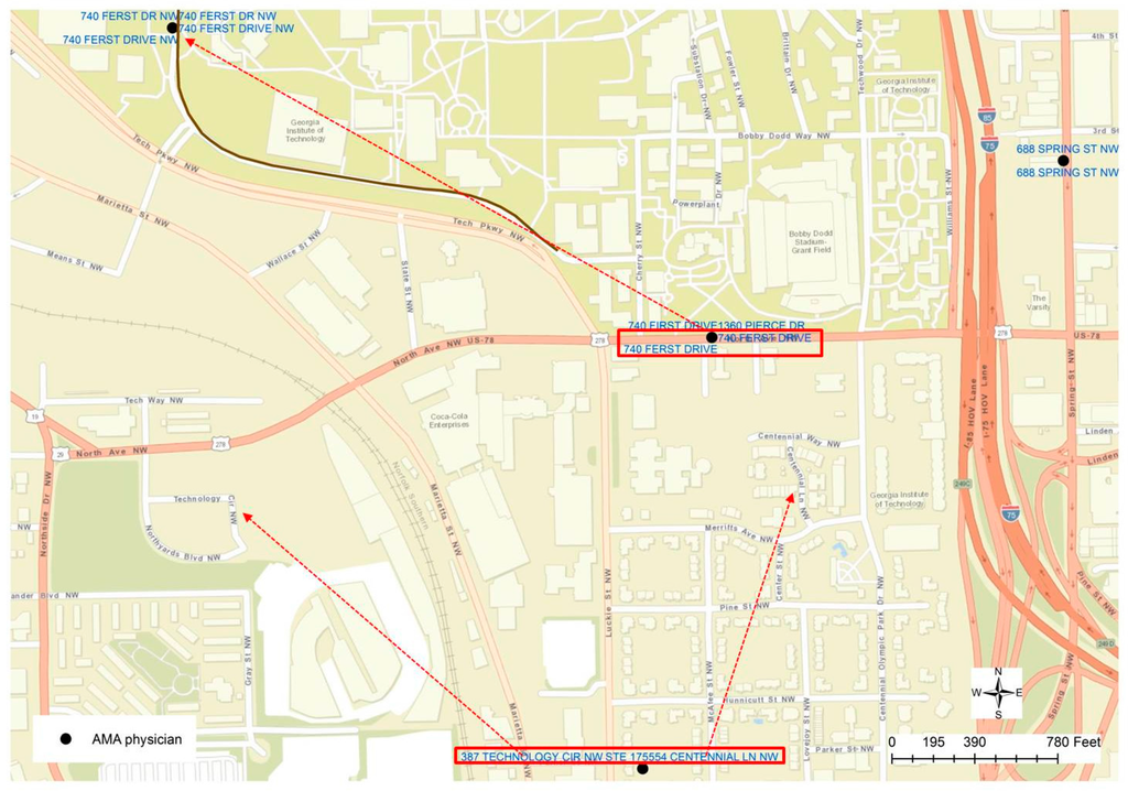 As a typical scenario, if any cluster of physicians’ addresses are classified as residential locations, or cannot be matched to the nearby parcel data, it would imply a potential problem. For example, in Figure 2, several clusters of physicians’ locations on the street “COLLIER RD NW” were initially classified as residential locations. It will be strange if 77 physicians’ homes are located at the same address as “35 COLLIER RD NW”. Such an error was generated in the fuzzy matching process without any consideration of odd or even street numbers. In this case, the physicians’ addresses (35, 77, 95, and 105) could be matched to the parcels on the other side of the road with even street numbers (8, 18, 20, 28) if odd street numbers (5, 11, 275) are ignored.