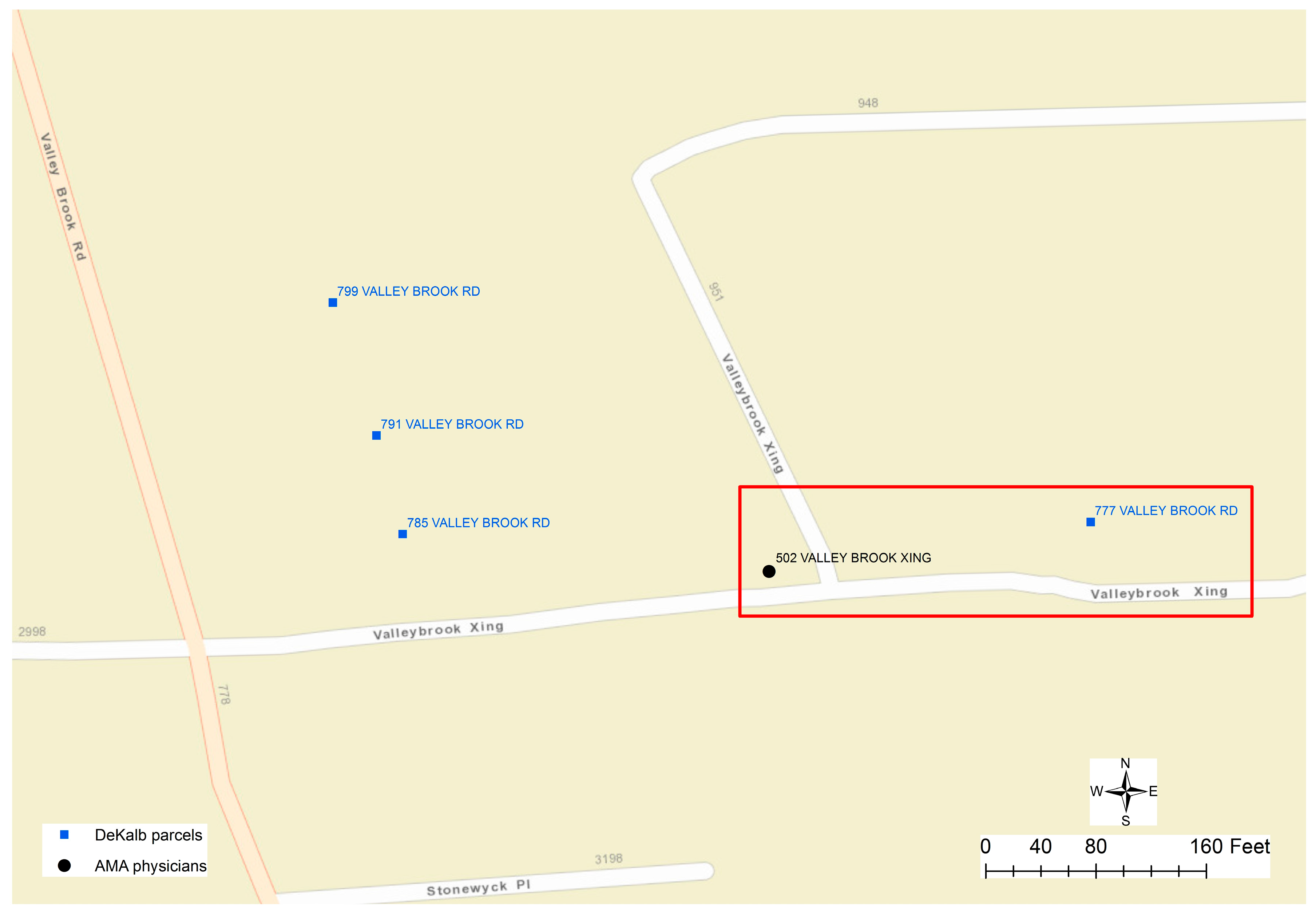 In another example, Figure 6 displays three clusters of 50 physicians’ addresses that cannot be matched to nearby parcel addresses. Eventually, the difference in the street name was identified as the cause of this problem. The street name of physicians’ addresses is recorded as “MERIDIAN MARKS RD”, while in the parcel data, the street name is “MERIDIAN MARK RD”. While the parcel datasets are used as the reference data to compare and match addresses in physicians’ data, regrettably, the parcel datasets also contain potential errors. Figure 7 displays a mismatch, in which the physician’s address is “502 VALLEYBROOK XING”, while the only address for parcels along “VALLEYBROOK XING” could be wrongly documented as “777 VALLEY BROOK RD”. As a conclusion, errors in the addresses of both physicians’ and parcel datasets could result in unmatched cases.