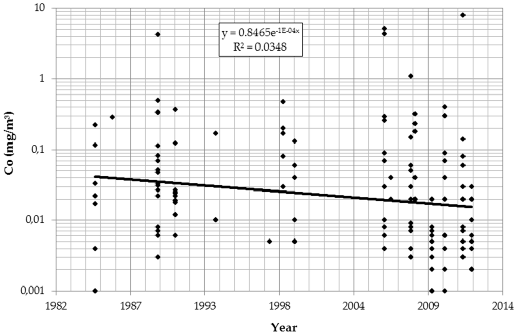 The study made use of routine data collected for legislative and administrative purposes. Because of data protection and privacy issues, many personal details of the participants were not available. The data analysis was further hampered by incomplete data (e.g., on smoking behavior) and by a huge variation in measurement methodologies over time. The regression analysis indicated that most of these differences did not significantly affect the results and dropping these parameters did not substantially change the point estimates for time trend and department effects. This finding is in line with the claim by the ÖSBS that all the methods used over the years were equivalent. Only personal versus area-level sampling affected the other point estimates, although in the case of cobalt the concentrations found by the two approaches did not differ significantly. Nevertheless, for future research and documentation purposes it is recommended to stick to a single measurement scheme and keep data in an easily accessible way.