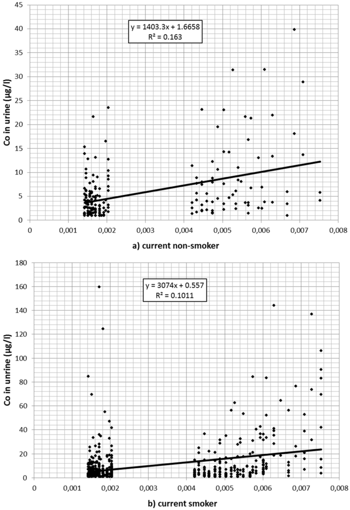The air and urine values of cobalt correlate with each other: for 1 mg/m3 cobalt in the air, there was an excretion of approximately 200 µg/L cobalt in urine (panels by workers). This ratio differs by smoking status. The Austrian occupational limit value for cobalt (0.5 mg/m3) is too lenient compared to the limit in urine (10 µg/L). According to our data, a concentration of 0.5 mg/m3 in the workplace air would lead to a urine concentration of at least 100 µg/L. Even assuming the stricter limit value in other industries (0.1 mg/m3) we would still expect a urine concentration of more than 20 µg/L. Most of the urine concentrations were below the Austrian limit value indicating that concentrations in the air well below the current Austrian limit values are technically feasible. This is underlined by a recent Swedish study as well [27], which reported cobalt concentrations (arithmetic mean, range) of 0.0030, 0.000028–0.056 mg/m3.