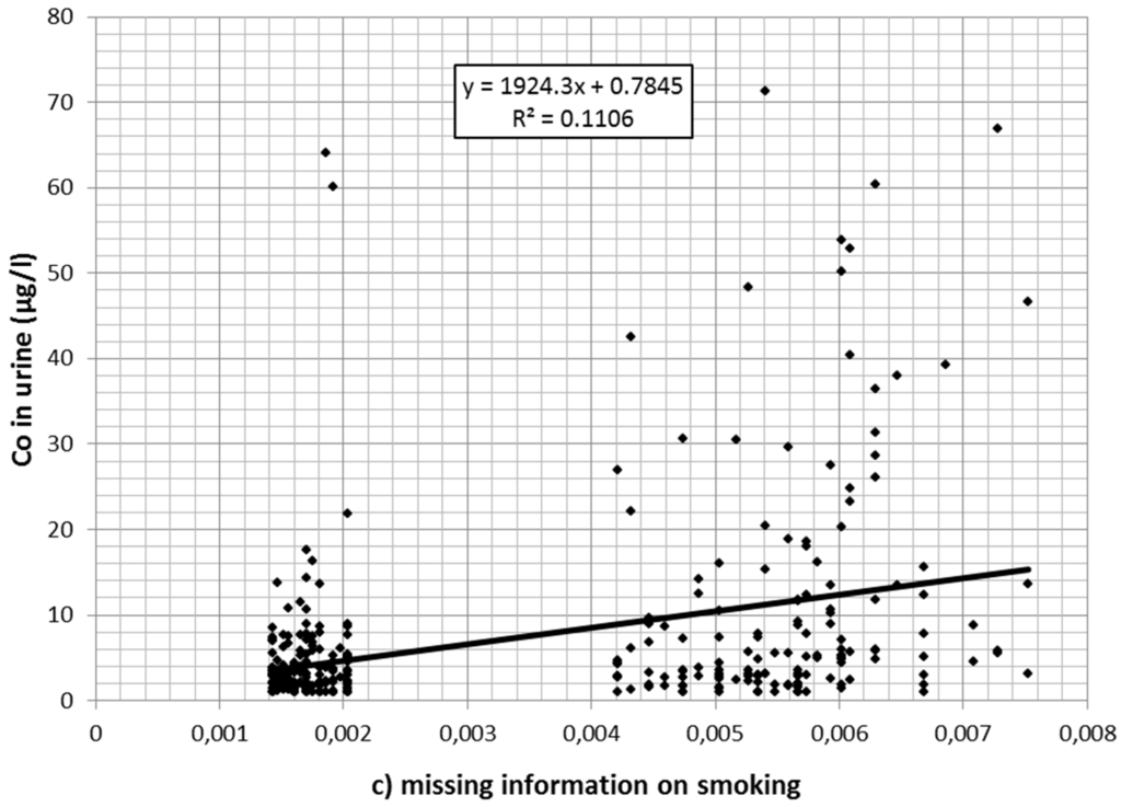 (a) Association between cobalt (Co) in the air (estimated from regression analysis) and cobalt in urine for (current) nonsmokers; (b) association between cobalt in the air (estimated from regression analysis) and cobalt in urine for smokers; (c) association between cobalt in the air (estimated from regression analysis) and cobalt in urine for workers with missing smoking information.