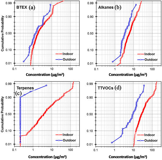 - Pekey, H.; Arslanbaş, D. The relationship between indoor, outdoor and personal VOC concentrations in homes, offices and schools in the metropolitan region of Kocaeli, Turkey. Water Air Soil Poll. 2008, 191, 113–129. [Google Scholar] [CrossRef]