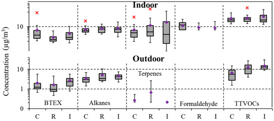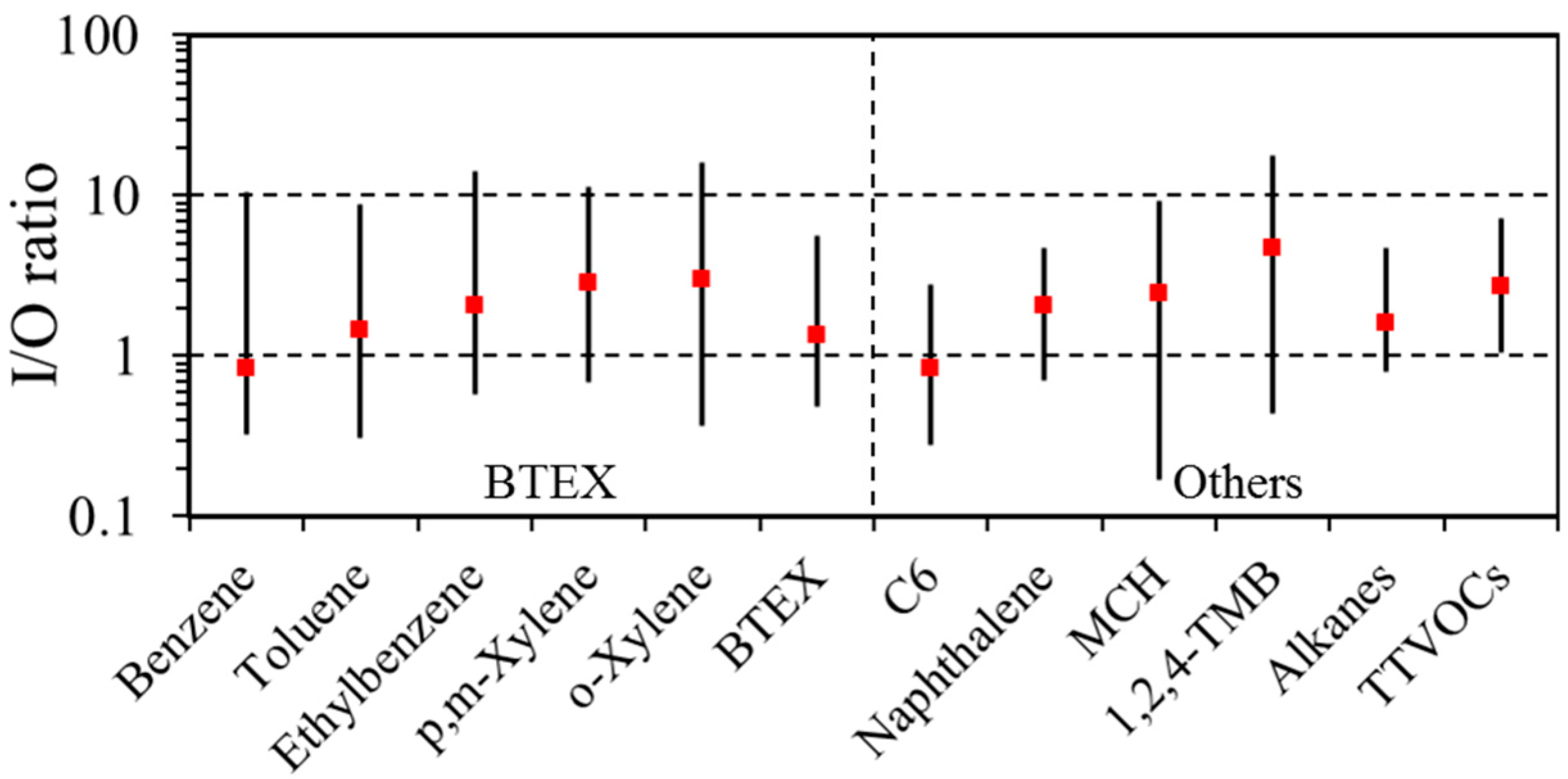 - Jia, C.; Batterman, S.; Godwin, C. VOCs in industrial, urban and suburban neighborhoods, part 1: Indoor and outdoor concentrations, variation, and risk drivers. Atmos. Environ. 2008, 42, 2083. [Google Scholar] [CrossRef]