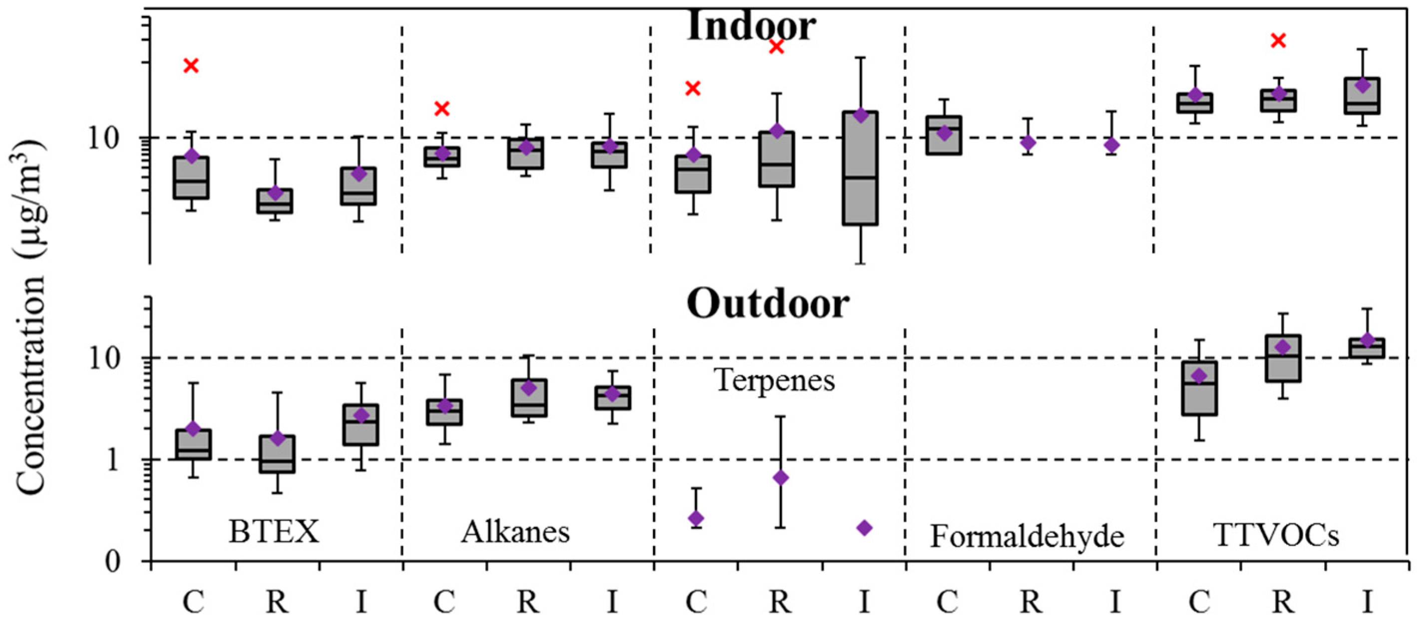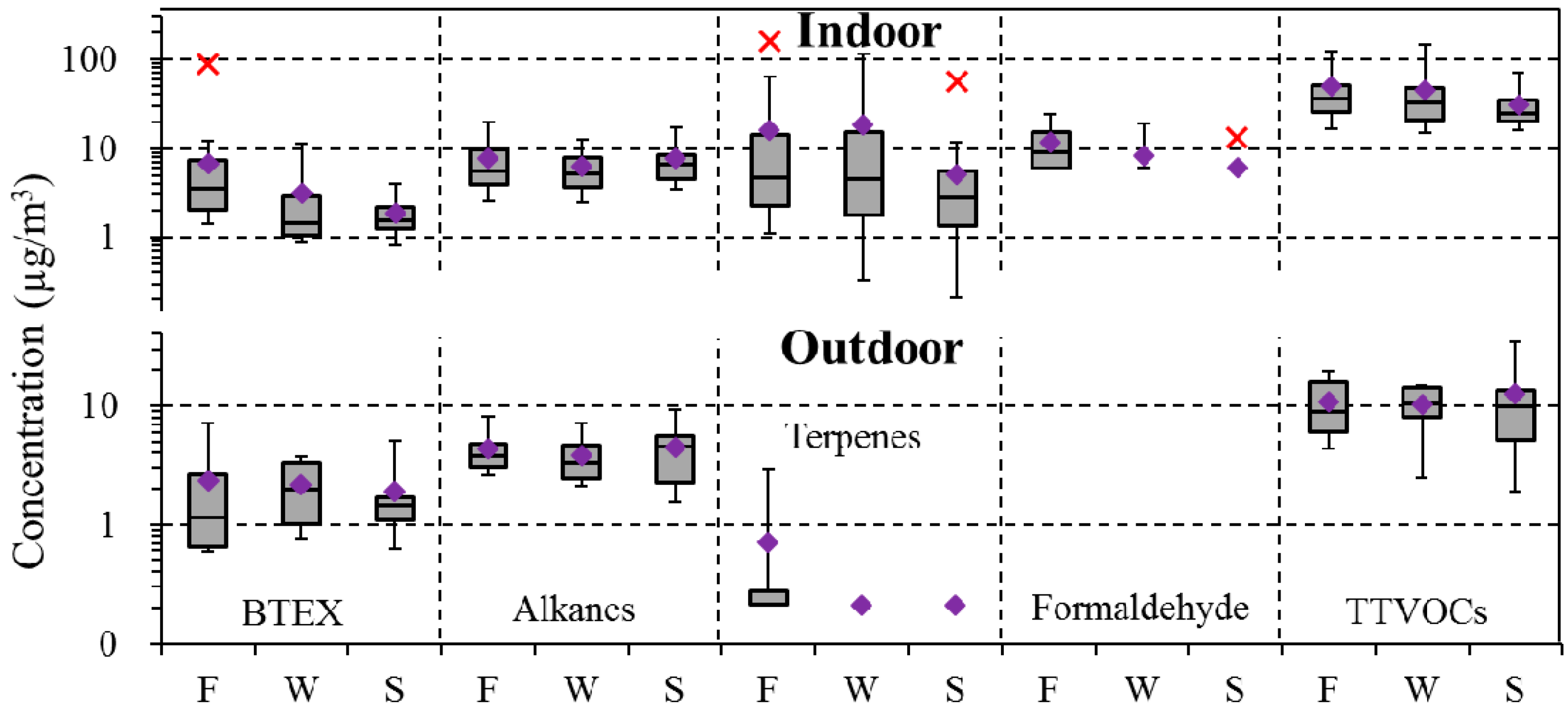 | VOC | Benzene | Toluene | Ethyl-Benzene | m,p-Xylene | o-Xylene | BTEX | Alkanes | Terpenes | Formaldehyde | TTVOCs | Occupancy | Rh (%) | Avg. CO2 | Daytime Avg. CO2 | Avg. Aer | Daytime Avg. Aer | Nighttime Avg. Aer |