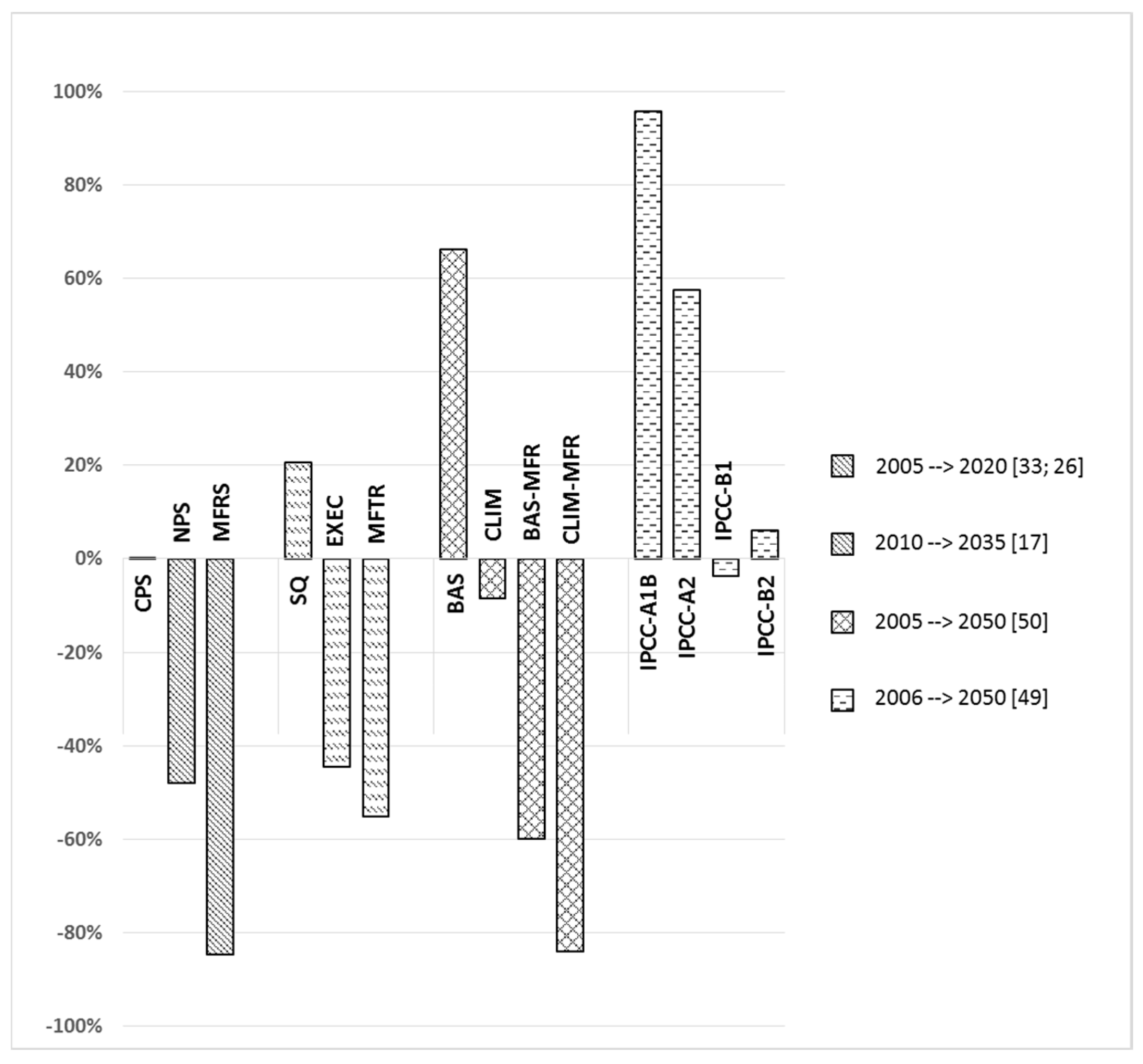 In Rafaj et al., 2013 [50], scenarios for the year 2050 were developed according to the greenhouse gas and air pollution interactions and synergies (GAINS) model and defined under baseline with current national legislation (BAS), climate mitigation scenario with current legislation (CLIM), baseline with maximum feasible reduction (BAS-MFR), and climate mitigation scenario with maximum feasible reduction (CLIM-MFR) policies. The study found that large co-benefits in terms of reduced mercury emissions can be achieved from the parallel control of air quality and greenhouse gases (GHGs), and that maximum feasible reduction strategies can substantially reduce future mercury emissions from the base year to around the same endpoint of 2035. Compared to the MFRS scenario in [26,33], maximum feasible reductions were around the same level.