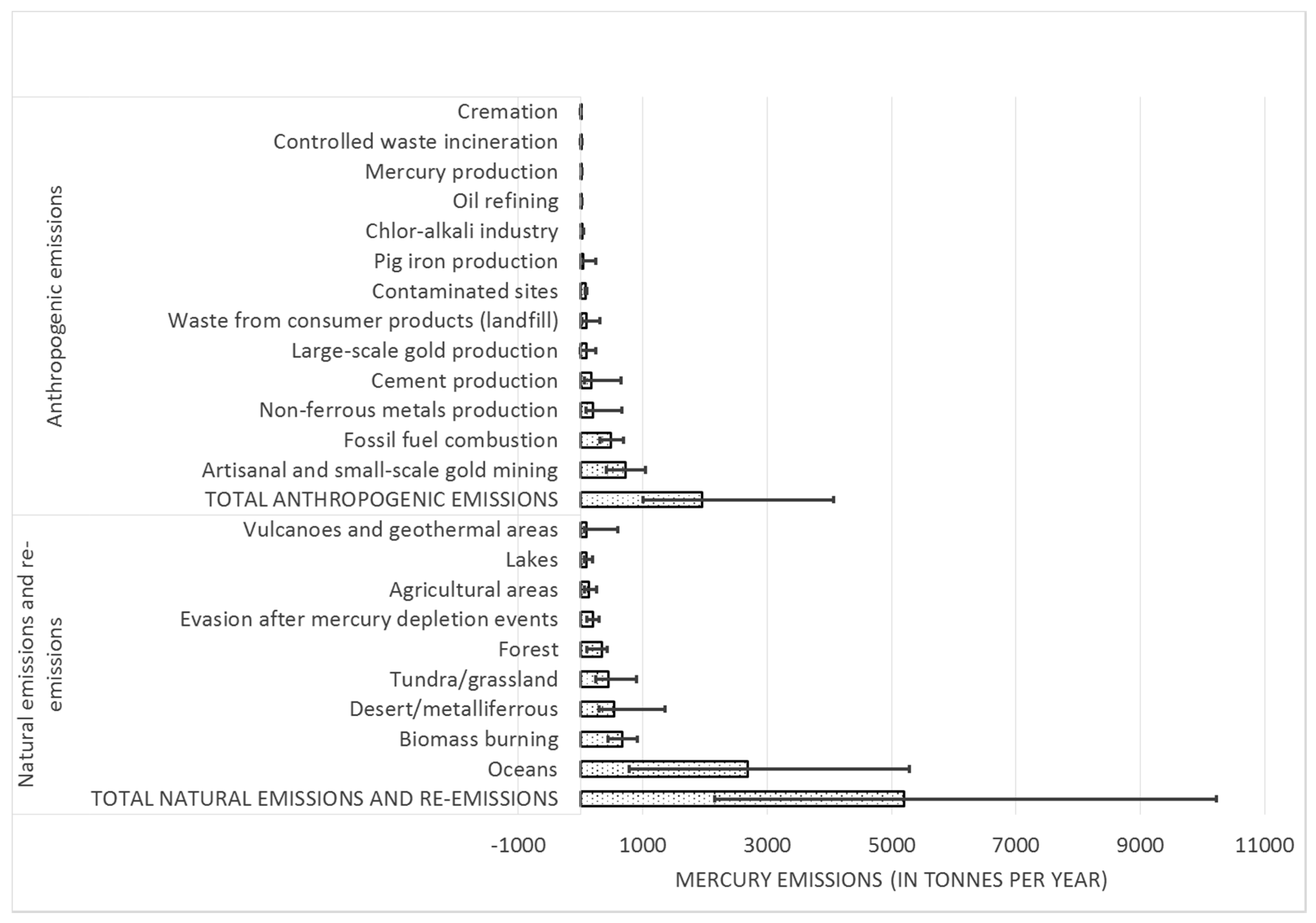 - Anthropogenic mercury emissions globally have been estimated to about 1960 tonnes·year−1 in 2010. Artisanal and small-scale gold mining (37%) and combustion of coal and other fossil fuels for energy and heat production in power plants and in industrial and residential boilers (25%) were identified as the major global anthropogenic emission sources to the atmosphere. Primary natural emissions and re-emissions processes of historically-deposited mercury over land and sea surfaces has recently been assessed to the amount of 5207 tonnes·year−1. The oceans are the most important natural and re-emission sources, contributing 36% of the natural and re-emitted emissions of mercury.