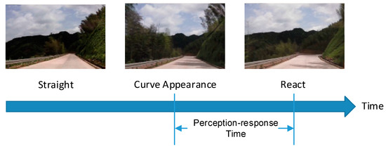 In this study, the perception-response time on a mountain highway curve is defined as the duration from the first sight of a curve’s appearance in a driver’s sight to the moment of the driver’s reaction (braking or turning). Figure 2 shows the meaning of this term. This identification is different from the perception concept in Embodied Cognition Theory [23], which reflects the overall response period from the curve appearance to the first detection moment of driver reaction (either steering or braking).