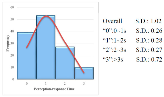 According to the video and vehicle data, the perception-response time of each test can be obtained. After eliminating incomplete and wrong records, 129 tests were applied in the following study. The population distribution of perception-response time shown in Figure 3 indicates that most tested drivers were inclined to respond between 1 and 2 s.