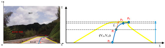 According to our previous study (see Yu et al. [27]), the road alignment in a driver’s vision can be described as a driver-vision lane (the blue line in Figure 5) during the process of driving. The driver-vision lane model is based on Catmull-Rom spline to fit with a driver’s visual perception (a detailed explanation of this model is available in Yu et al. [27]). Perception characteristics of road alignment in this research include the following elements obtained by the driver-vision lane model. The bottom-left corner of the on-board driving recorder video is set as the origin of coordinate.