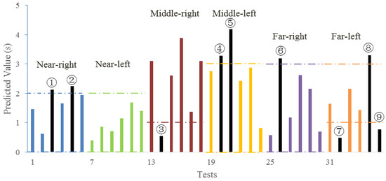 In Figure 8, the black bar stands for the tests of which the predicted PR time is inappropriate (beyond or below the recommended range). The dash line is the recommended range of PR time according to the 85th quantile in Figure 4. The PR times of most drivers were within this range. On near-left curves, no sample was beyond the recommended range. All cases (black bars) with unsuitable PR time were detected by the assistance model (see Table 7).