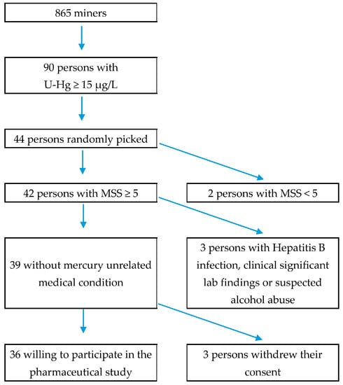 For the conduct of the second part, persons with a urine Hg value above 15 μg/L were selected and examined further, if they qualified for the participation in the pharmaceutical study [18]. The exclusion criteria for the pharmaceutical study aimed at existing medical conditions in the participants: renal disorders or failures, abnormal results in haematology results, neurodegenerative disorder, drug or alcohol abuse, pregnancy, serious infections, allergies to the drug or its components, and participation in another drug study, which only were relevant for the experimental treatment. Persons that exceeded the threshold limit (15 μg/L urine) were invited to the local study site in the chronological order that their urine samples had been examined, until the aimed sample size for the pharmaceutical study of 36 participants was reached. For all invited patients, the mercury intoxication medical score sum (MSS) was assessed with a questionnaire and a medical test [18,19]. Apart from a high Hg in urine level, the subjects were to have a medical score sum of over 5 or, alternatively, of 3 out of 10 plus 2 out of 6 further symptoms of a chronic intoxication (e.g., physical fatigue or memory loss) [19]. Further data were obtained for 44 persons, which included 36 participants and eight screening failures (Figure 1). Those eight were excluded from the pharmaceutical study because of mercury unrelated medical conditions, not meeting the MSS inclusion criterion, or because they were not willing to participate further (see Appendix A for details on exclusion criteria).