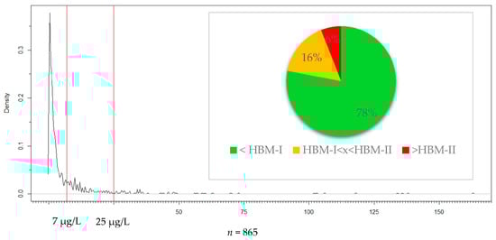 The threshold values for mercury in urine are based on the recommendations of the Human Biomonitoring Commission [21]. It distinguishes between two Human Biomonitoring levels, HBM-I and HBM-II, to categorise the exposure level. Concentrations below the HBM-I limit are considered harmless and are not known to cause adverse health effects. Values between HBM-I and HBM-II are posed as a warning sign and the exposure should be reduced or eliminated as far as achievable, since adverse health effects cannot be excluded [22]. Values above the HBM-II threshold indicate an increased risk for negative health effects, therefore a reduction of the burden level is essential and a medical examination is advised [21,22]. The two HBM levels for Hg in urine are 7 μg/L and 25 μg/L. Additionally the threshold value of the biological exposure indices (35 μg/L), a recommendation of the American Conference of Industrial Hygienists, was examined.