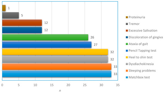 The chronic intoxication medical score sum had a range of 2 to 8 out of 10 points with a median of 6 and a mean of 5.8 points. The most common signs for an intoxication in the 36 patients were sleeping problems (91.7%), dysdiadochokinesia (88.9%), ataxia of gait (72.2%), and especially the neuro-psychological tests proved to be very sensitive: matchbox test (91.7%), heel-to-shin test (88.9%), and pencil tapping test (75%) (Figure 3). The data about the symptoms were only available for the 36 study patients. The assessment of further chronic symptoms was implemented after a protocol amendment and included 24 persons. Of those, physical and mental fatigue (each 62.5%) were the most frequent, followed by social nervousness and/or withdrawal and easy irritability (both 54.2%). The fatigue scores ranged from 0 to 11 out of 16, with a median of 3.5, for physical fatigue and from 0 to 5 out of ten, with a median of 1.5, for mental fatigue.