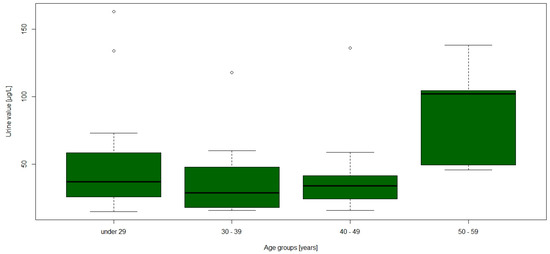 Spearman’s correlation analysis confirmed a significant weak to moderate correlation of the Hg values in urine and the MSS (rs = 0.381, p = 0.01). All the correlations were not statistically significant. Weight was weakly negatively correlated to Hg in urine (rs = −0.255, p = 0.094), whereas age showed a weakly positive correlation with MSS (rs = 0.259, p = 0.090).